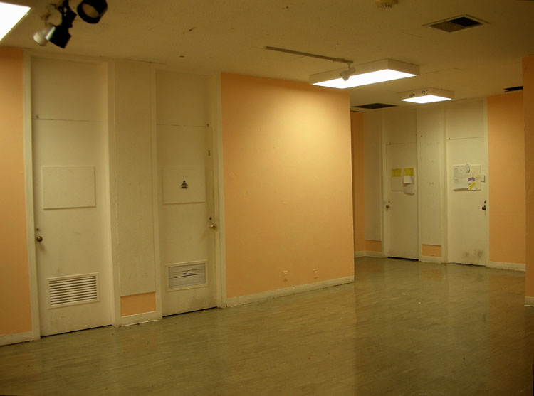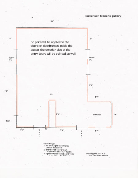 The change in wall color enacted three trajecories of responsiveness: as (1) a directed separation between usable wall space and door object, (2) the differentiation between the surface of codified art space in context of a perpetually unlocked gallery and the privacy entailed in the doors of the offices and studios beyond, and (3) a demonstration of the shift in which this color might have when applied to the entirety of an enclosed space, devoid of direct natural light, a dynamic condition of the windowless Stevenson Blanche space. Throughout the gallery, an existent a vinyl baseboard ran along the perimeter of the walls, breaking whenever a door-frame occurs in its path. In leaving both this baseboard and door-frame the existent gallery white color as they normally existed brought on by successive overpainting of the walls, the doors fell into beats on a circuit that traced the space and furthered the relationship between (1) and (2) above while underscoring the willful erasure exhibited by previous artistic engagements intent of removing framing, doors and baseboard that would decidely draw away from a seamless exhibition-prepped environemnt.