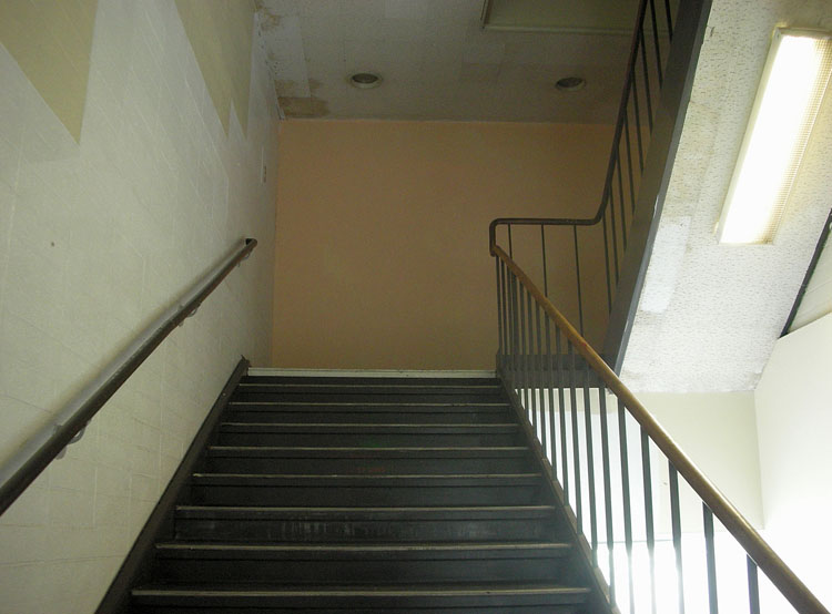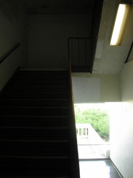 A decision was made to leave the Cashmere Paw color on the stairwell partition and entry doors to the Stevenson Blanche space after the internal gallery had been returned to its standard Dunn Edwards variety white as the problem of this partition in relation to the window wall of the hall was still a present concern. The added color brightened the stairwell in a similar capacity to the Langley D300a space.