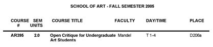 While the work did not have a title, a supplementary title-like card was provided which comprised the most basic publically-accessible information on the class found in the course catalog published by the institute that term. This information provided an embedded caption for the projected image: the room number, time and day, instructor's name, and course title moved a viewer to a clearer understanding of what the slightly blurred slide projection consisted of, which alone was no more than a white room with a table and chairs. The card was placed inside the projected field of light on the wall, positioned just within an interior corner of in the work, to distinguish it from presenting as an externalized didactic supplement. This embededness also served to take association away from the image being the central focus as it was also the light source through which the information on the card was easily legible. The projection pragmatically highlighted the course information on the wall of a specific room and specific use inside the gallery space, which had become an extension of the classroom through its members albeit not part of a conjoined architecture under the circumstances here.