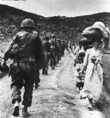 American soldiers and Korean civilians pass each other near the 38th parallel
