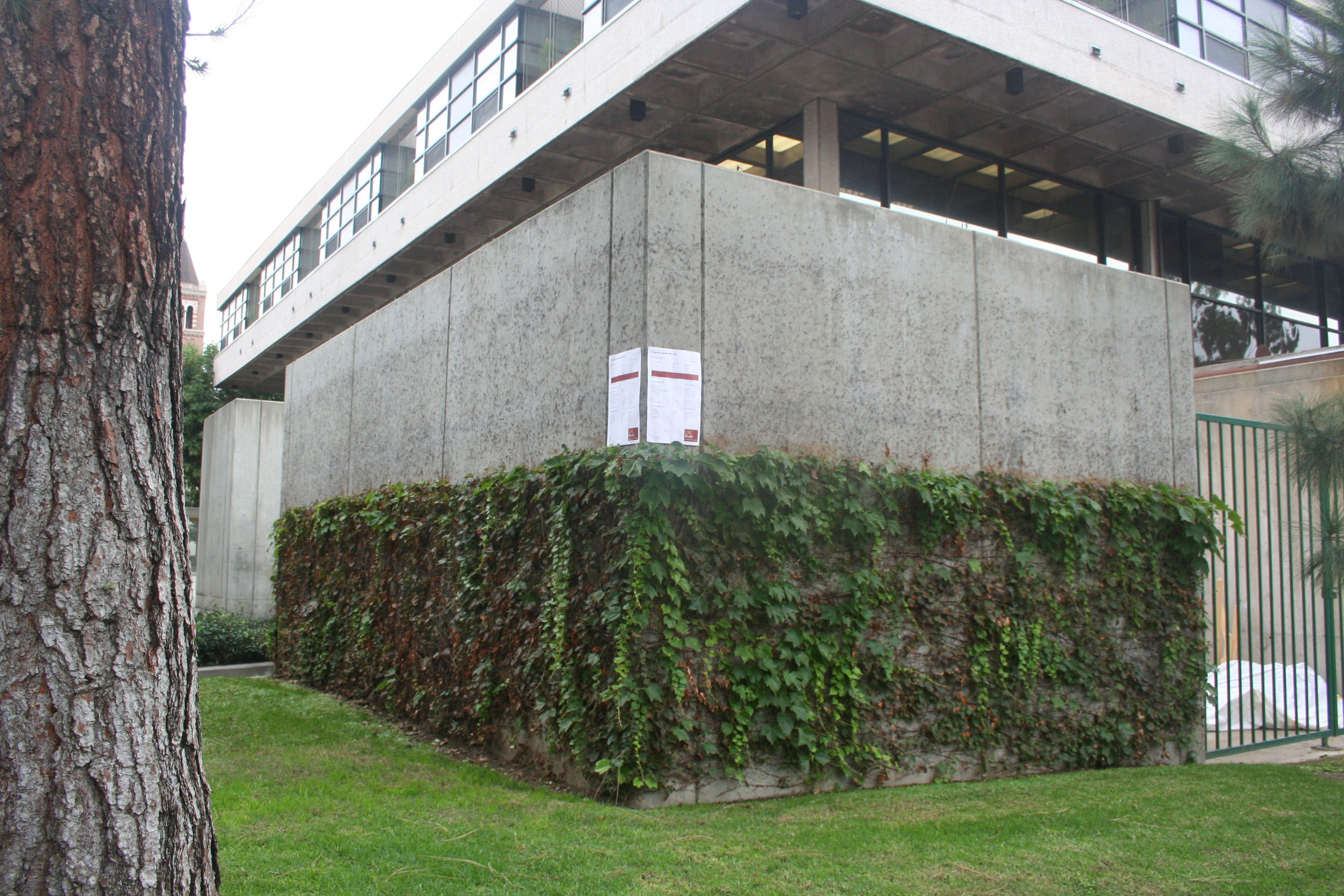 During a preliminary site visit to the "Chapel" and greater campus, I tracked down the university registrar's office to be temporarily relocated within a student dormitory hall due to the eventual demolition of its prior facilities, a 1963 "international style" structure designed by USC alumni Thornton Ladd and John Kelsey, colloquially known as "The Red Square", the perimeter of which was by this visit already sqaured off by red fence screen. This additional campus colloquialism was in reference to the structure's initial use as the preeminent west coast think tank on communist intelligence and data gathering during the Cold War era. First put on the market for potential bidders that would relocate the two-story structure off-site, lack of interest in this process spelled its demolision.