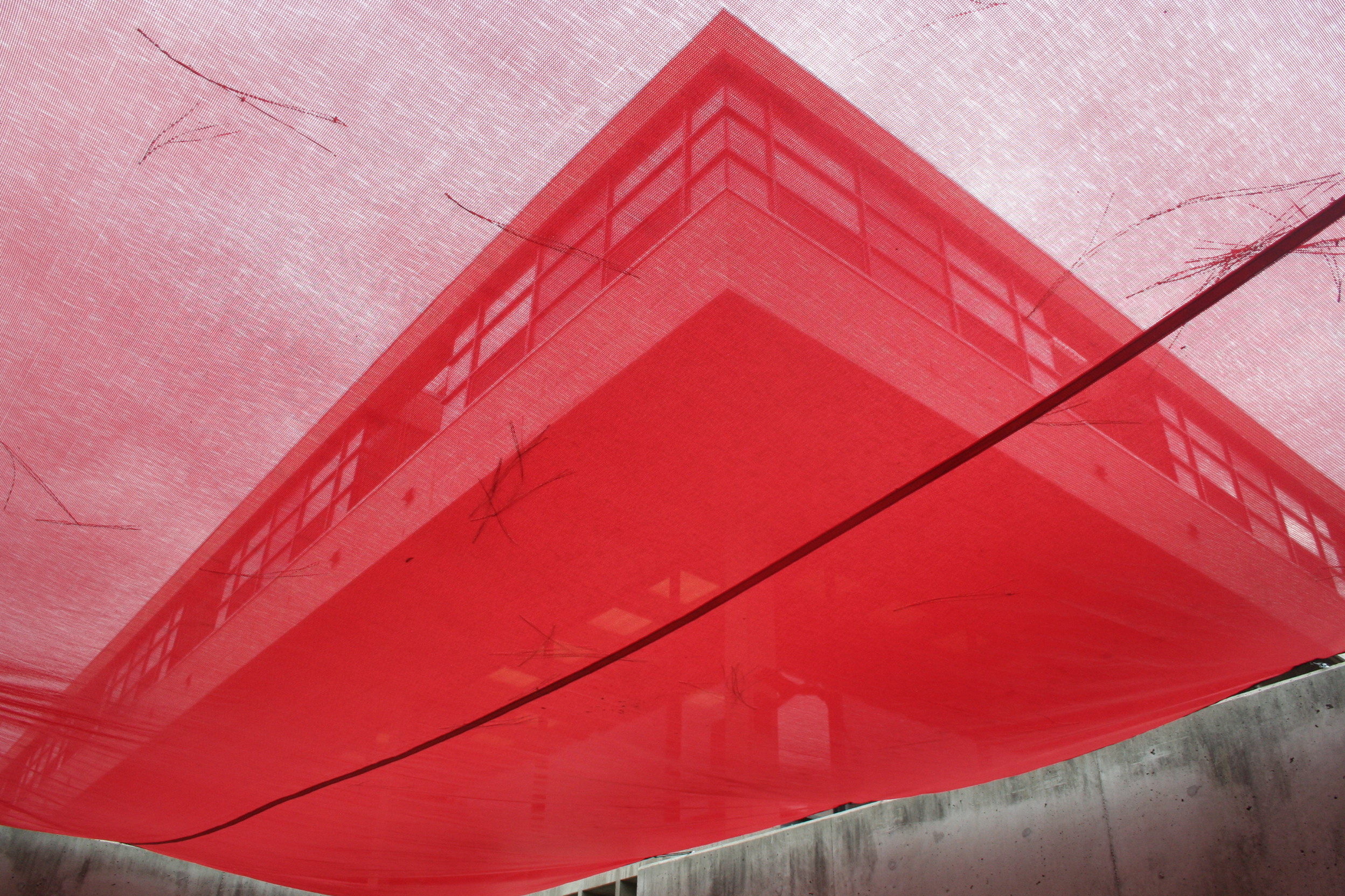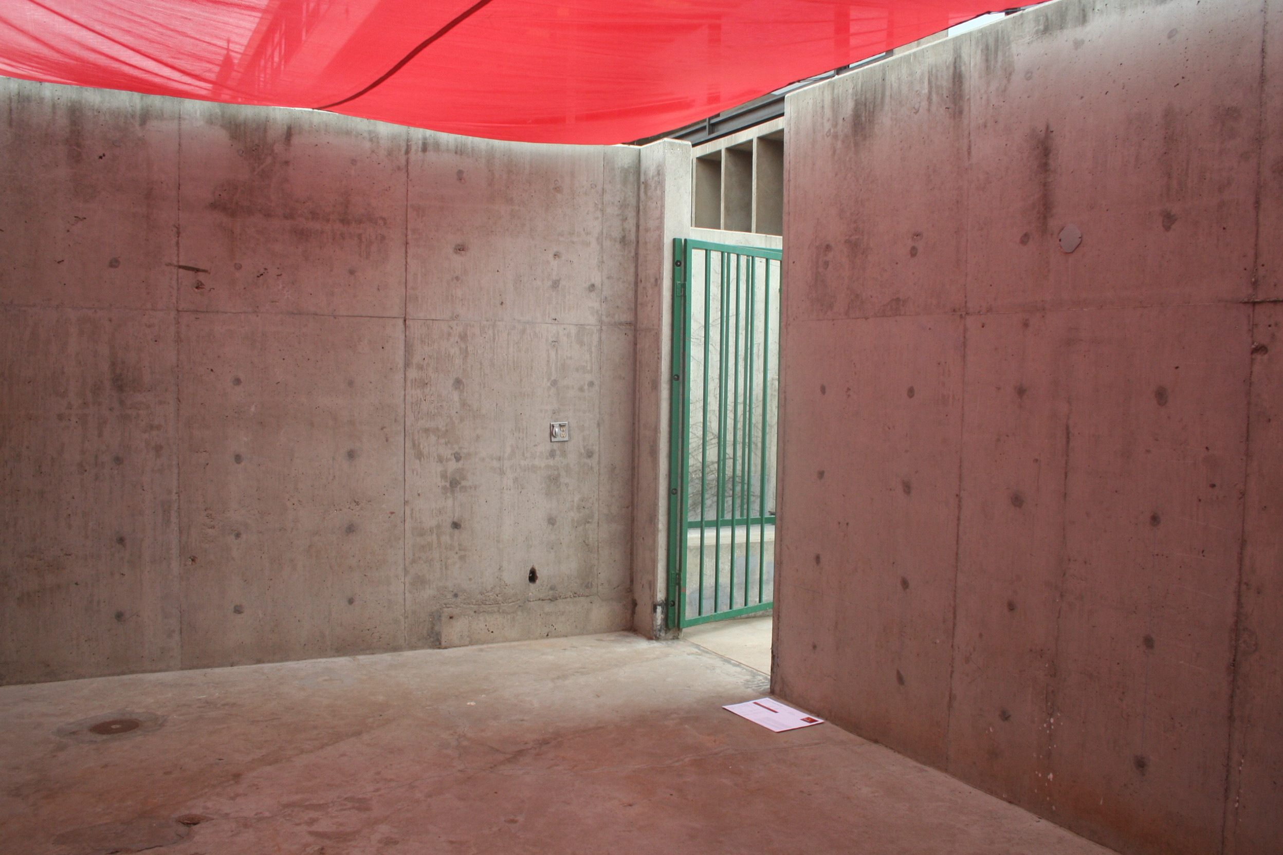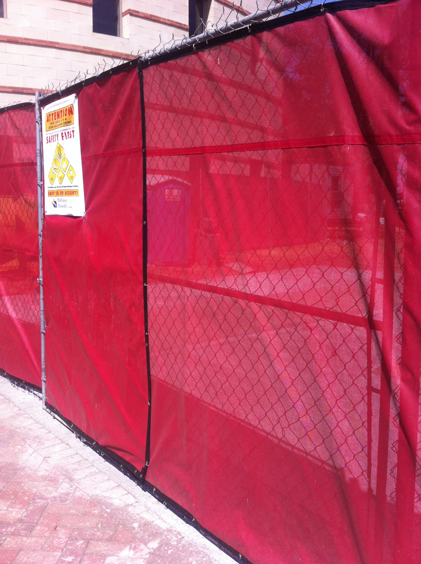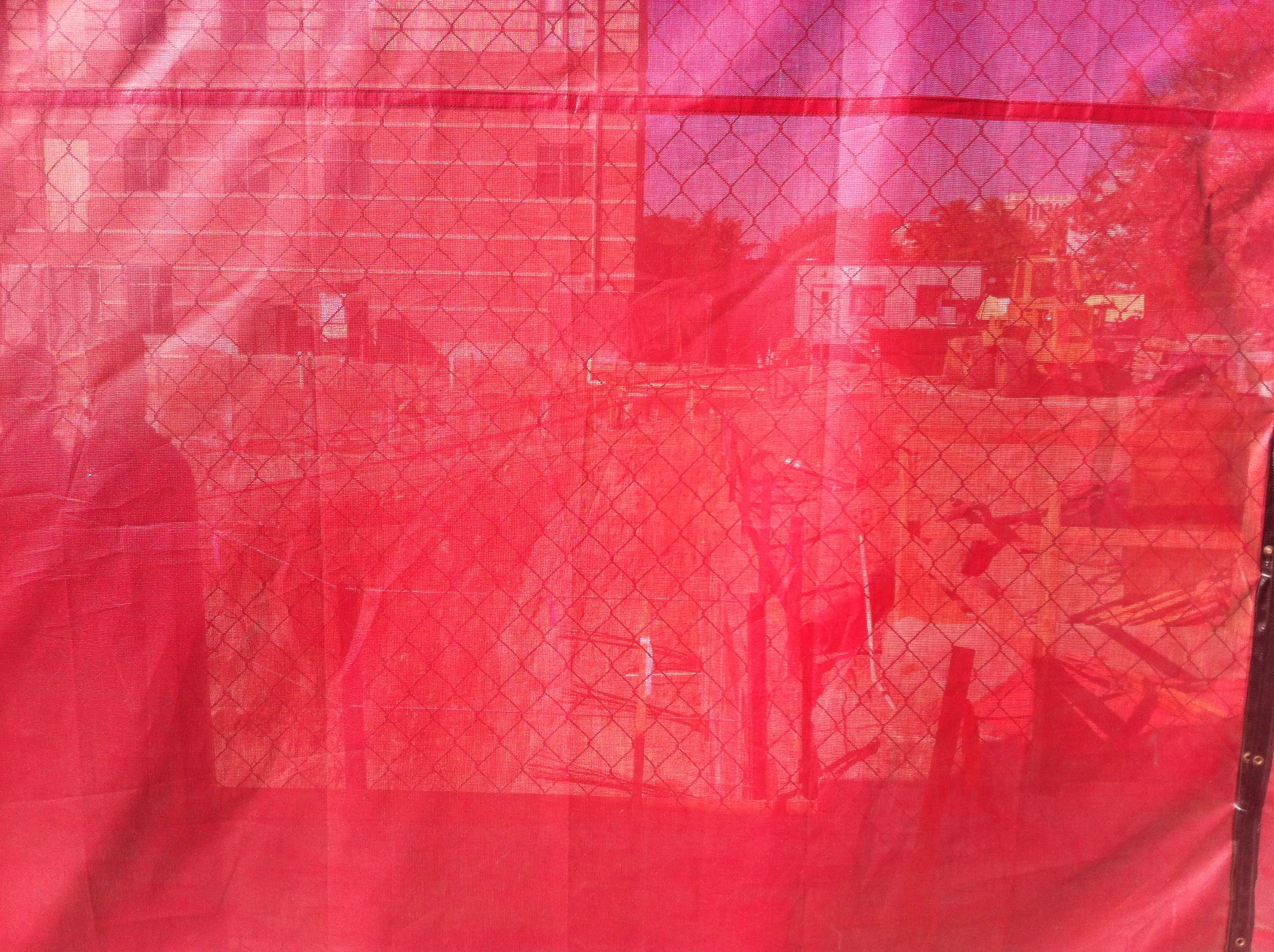A modification as in-kind donation at the University of Southern California in from December 1- 17, 2014 applied the type of fence screen proximal to school colors already utilized at construction sites around campus as a temporary canopy to a roofless structure within the Roski School of Art. Inverting the indication of a construction area signaled attention to then current internal top-down bureaucratic reformatting of this art program for faculty, staff and students. The screen produced a shaded interior with a defused red cast during a time leading up to and during semester exams.