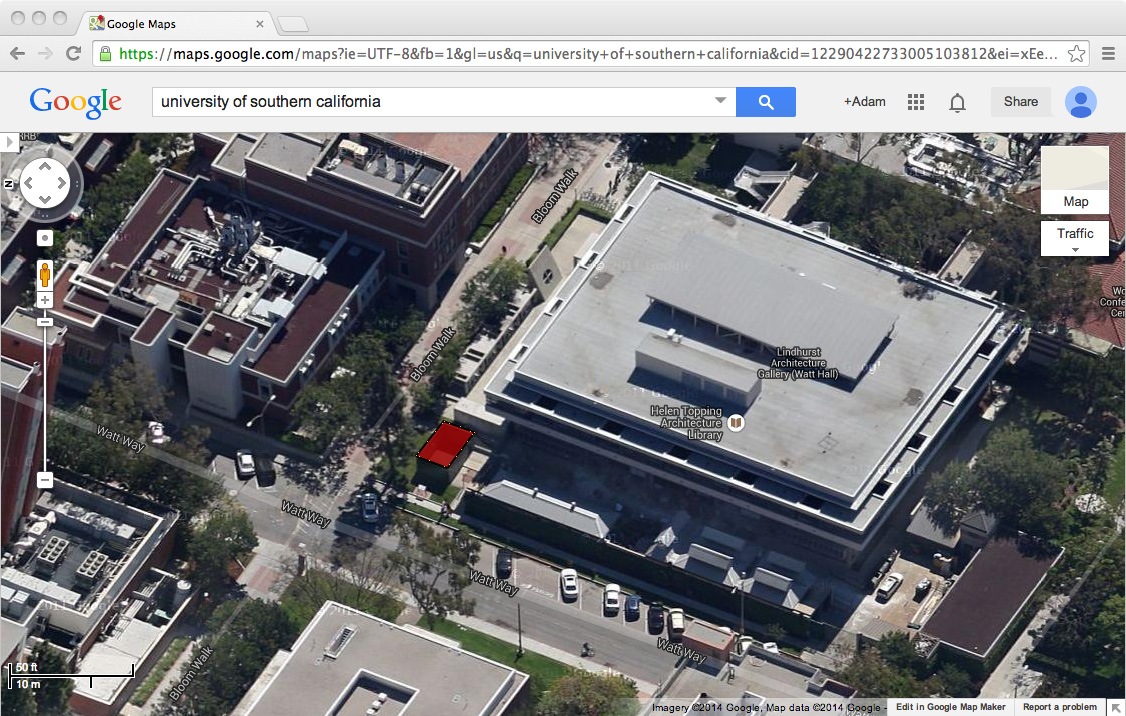 Through installing a screen perpendicular to its orientation at nearby building projects, I was interested how this axial turn cited construction while raising questions of the symbolic, quasi-transparency such facades imply in relation to a sense of bettering school facilities. Such instances can be more a mark of bureaucratic and administrative accomplishment in beautification than of any common betterment of and for the learning environment, often to the detriment of the immediate community losing ground in the interim. The turn repositions the implication of construction as coming from above while rendering the space within these limits as internal to the Roski School of Art and Design then under acts of soon contested revision on the part of students, faculty, and staff.