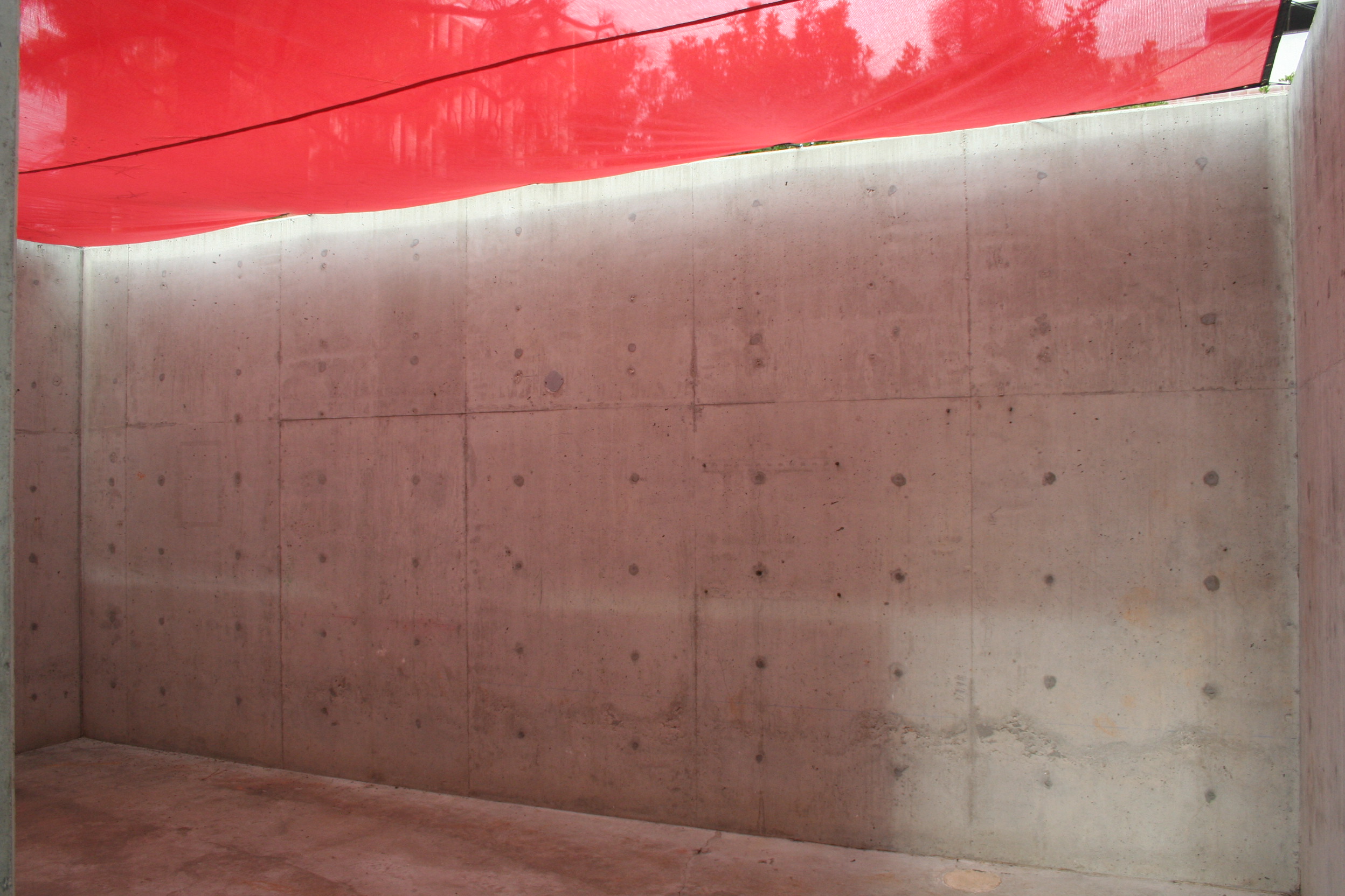 A red screen, equivalent to those of adjacent on-campus construction sites, sized to the dimensions of The Chapel's interior width and length, was installed from the last week of academic classes to the last day of semester exams. Not visible to passing pedestrians passing the non-descript, concrete structure at the intersection of Watt Way and Bloom Walk and the northern corner of Watt Hall's footprint, views were skyward from within the now enclosed interior space, accessible via passage through Watt Hall, and downward from the higher stories of Watt Hall and adjacent buildings. Daylight cast a defused cardinal shade inward proximal to school business hours.