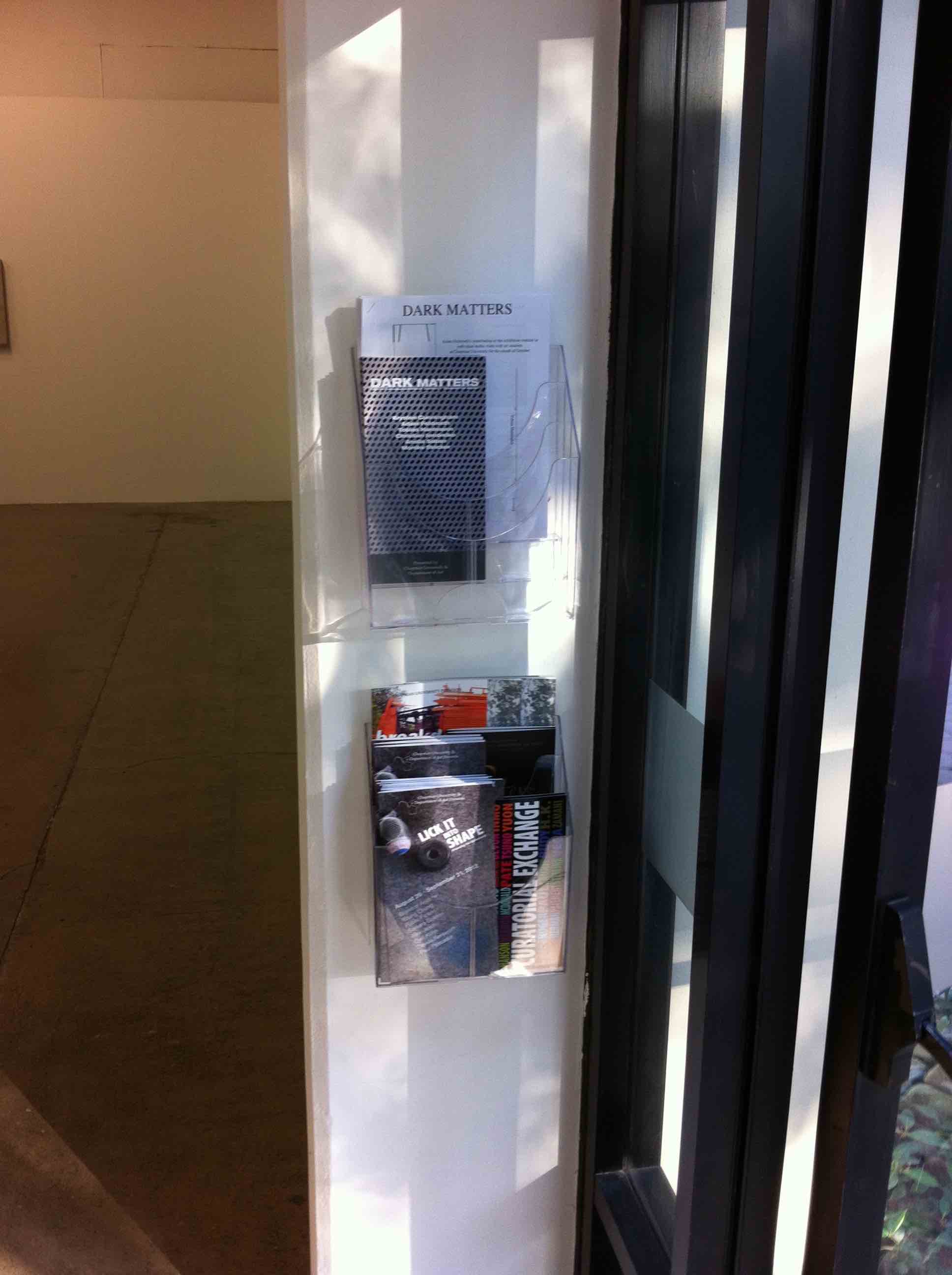 Copies of a trifold brochure, published with the exhibition, were in a two-pocket tiered acrylic brochure holder, available on a narrow section of wall directly to the right of the entrance doors to the gallery space. Additionally, copies of an exhibition map and a title list for the Dark Matters show, stapled together, were also found, in the second tier, of this acrylic holder. These items are used for contextual and situational use inside the room as well as free take-away. The documents were standard to the curated exhibitions at the Guggenheim Gallery at the time of the exhibition. An identical holder is mounted below this one holding the brochures from recent past exhibitions. While this brochure holder and its contents were not a unique presence to this show as forms, they led toward a partial framing of my participation.