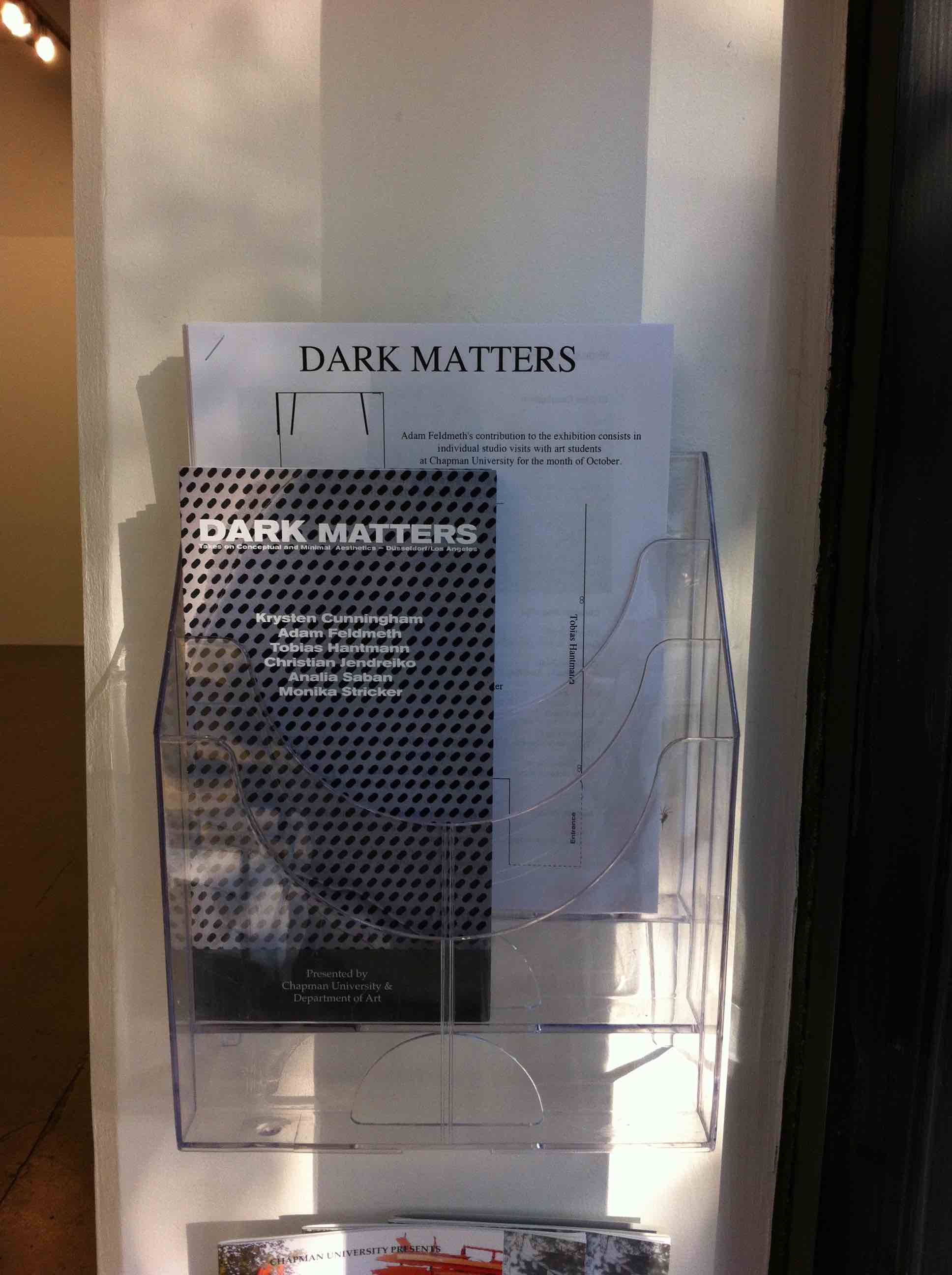 In early fall 2012, I was invited to participate in an exhibition being organized by Marcus Herse, curatorial director of the Guggenheim Gallery located at Chapman University in Orange, California entitled, Dark Matters: Takes on Minimal and Conceptual Aesthetics - Düsseldorf/Los Angeles. The notice came with very little time to develop a project. After a site visit to the academic campus and gallery and researching the history of the Art Department, the architecturally connected Guggenheim Gallery, and the university as diligently as I could, I submitted a proposal which was immediately accepted.