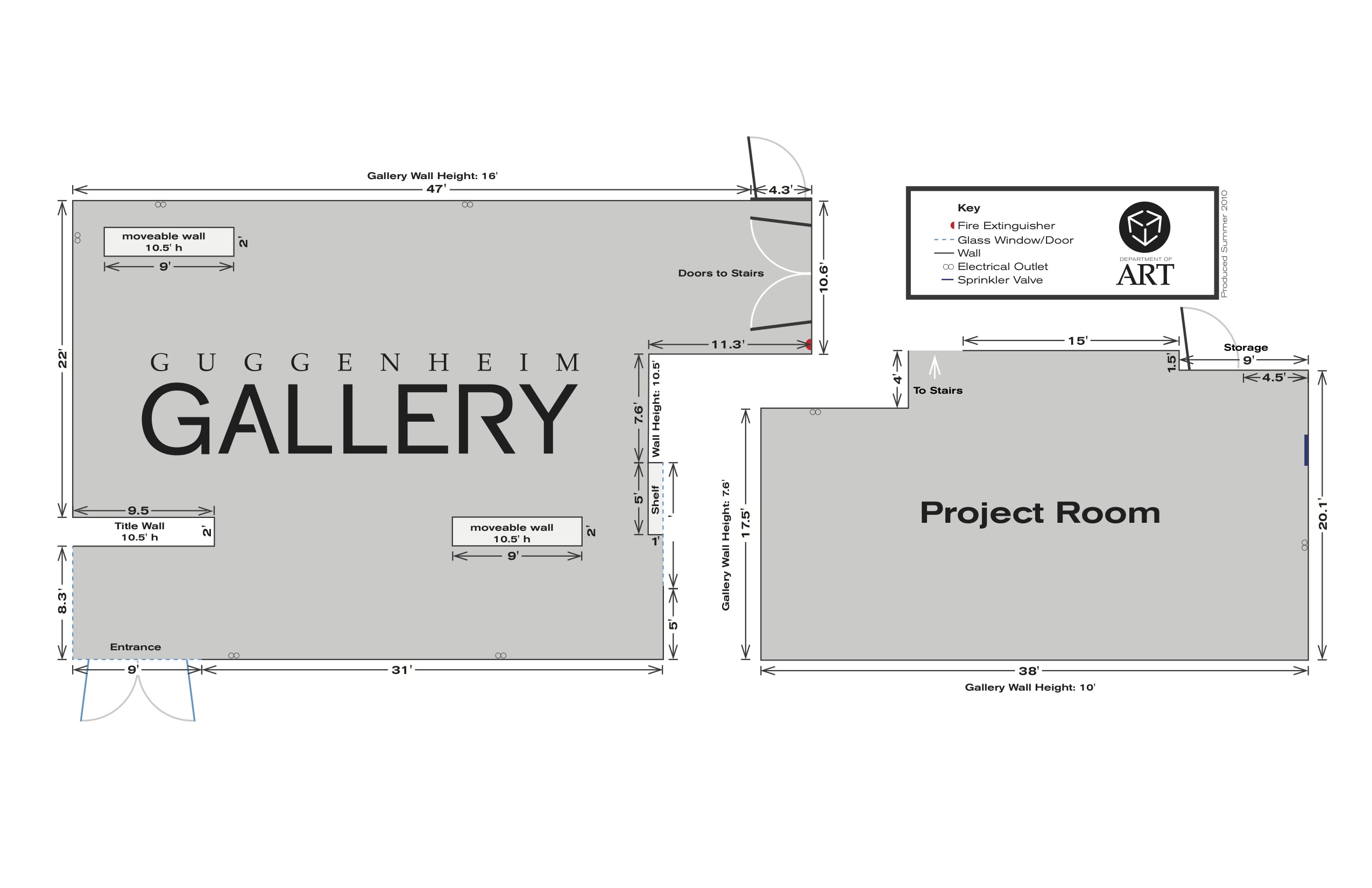 In an official floor plan of the Guggenheim Gallery not publicly available, a "Project Room" is pictured in addition to the main gallery room where the exhibition occurred. This space subsequently became an integral part of my placement in the show as an unmapped contributor. The Project Room is a room located on the second floor of the Guggenheim Gallery, adjacent to the south wall of the main room though at the time in no way apparent as existing to those unfamiliar with the architecture. One can enter this annex space by a stairway located in a hallway currently used for pedestal storage accessed through the passage marked "doors to stairs" on the official schematic. These doors remain closed during exhibitions though not locked during general hours. In the past, this project room was an auxiliary exhibition space for shows, but in the beginning of this academic year, as I learned through my research, had been reprioritized. The department of art had fully absorbed the space, re-designating it a critique room. The repurposing is why this former annex to the main gallery space was not included on the exhibition map in the Dark Matters show. I came to learn that the reason for this change was due to the department assessing a need for a space to discuss student artwork and projects which was flexibly available for any and all courses. Conveniently, the room has the attributes of an exhibition space because it was designed to be one. It is all to common in art education that collapses occur between spaces of discursive learning and those aligned for display.
