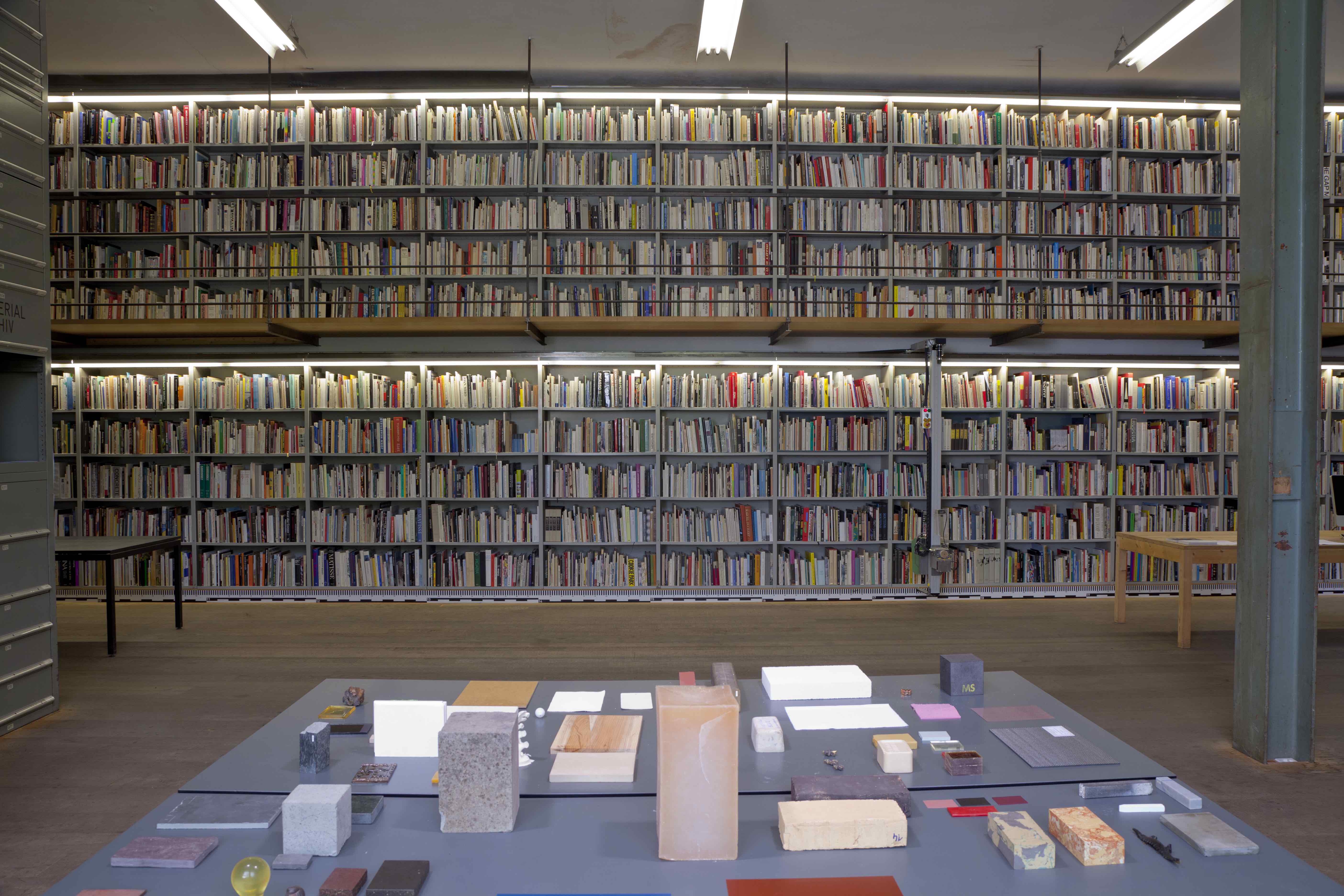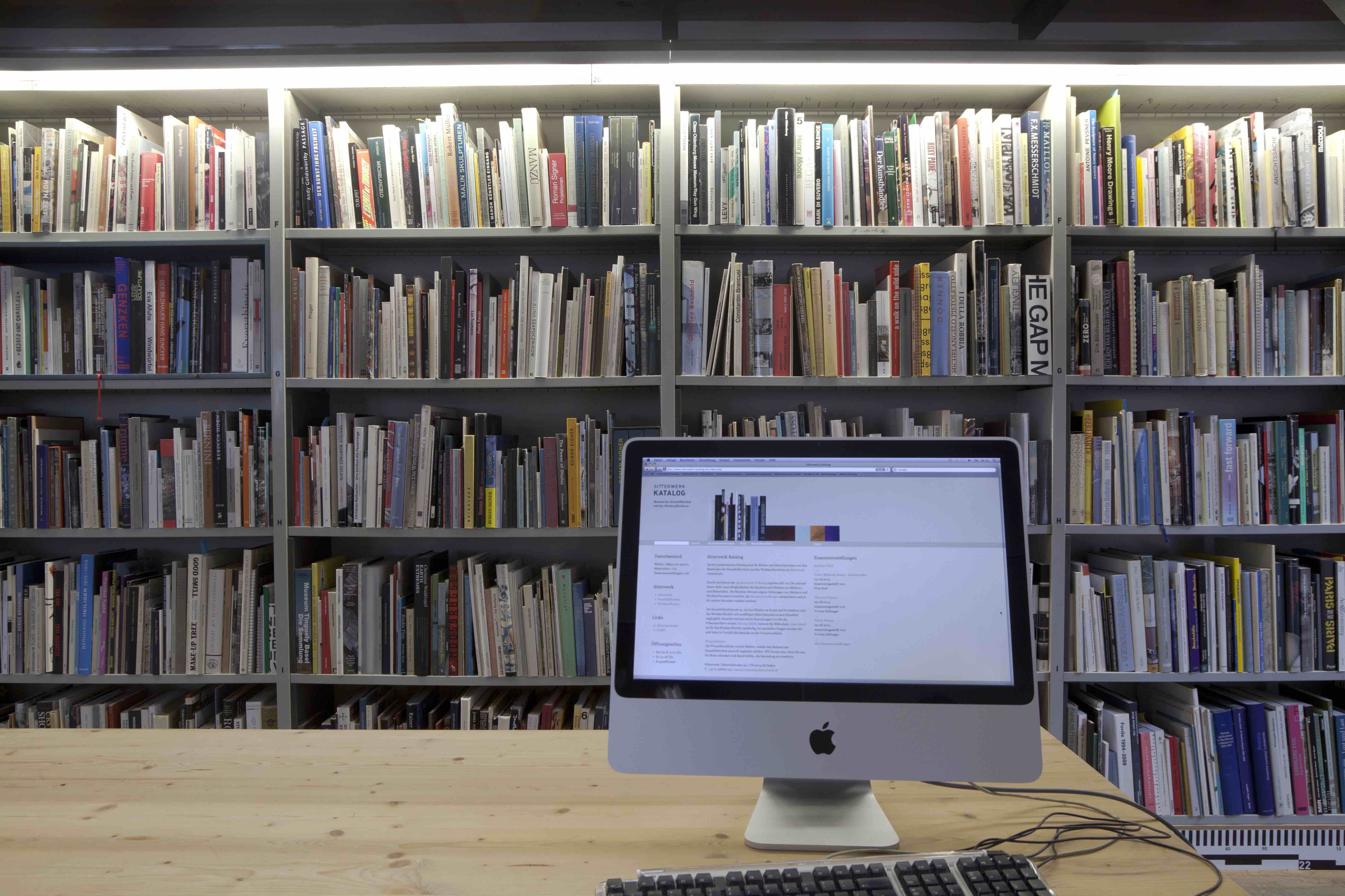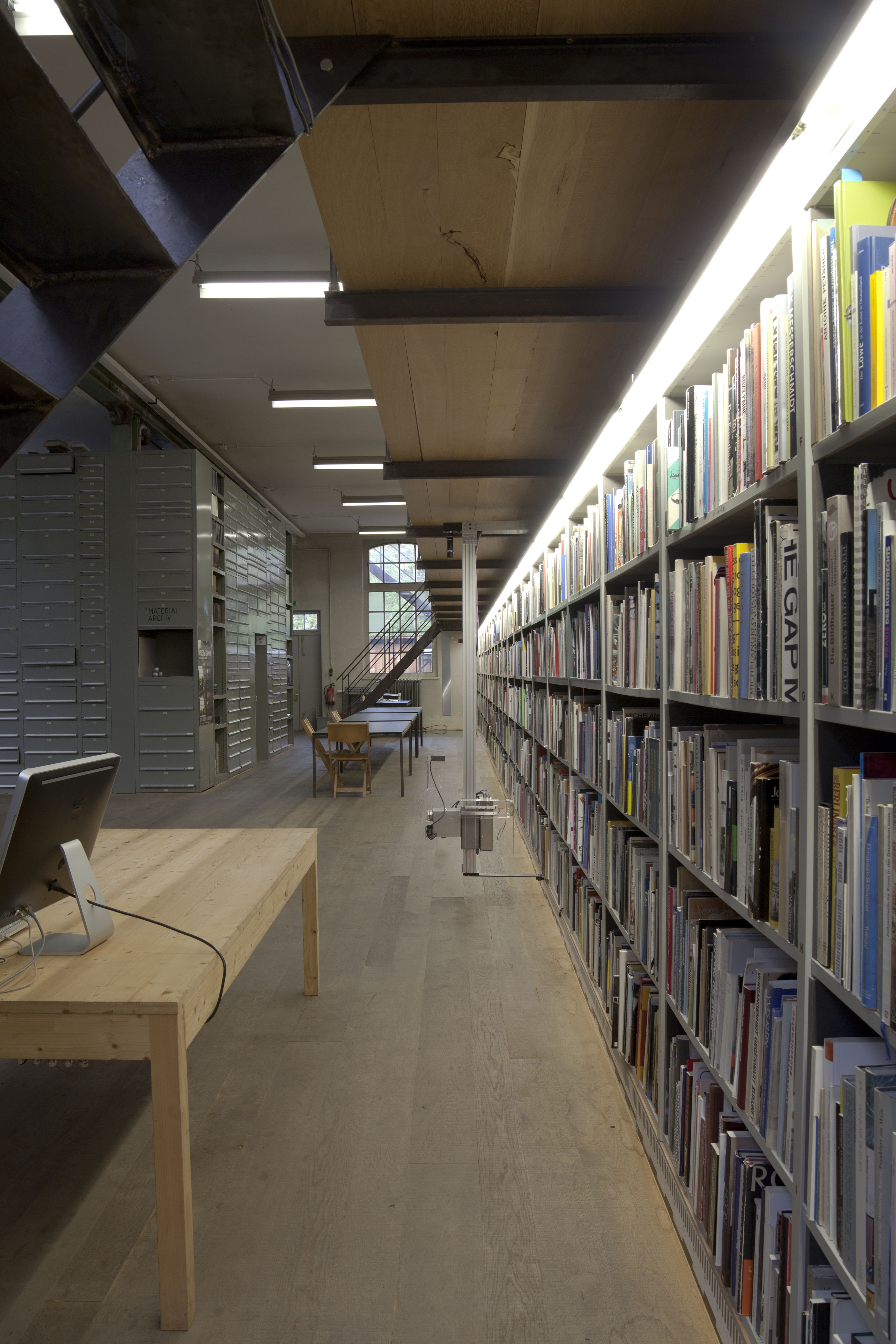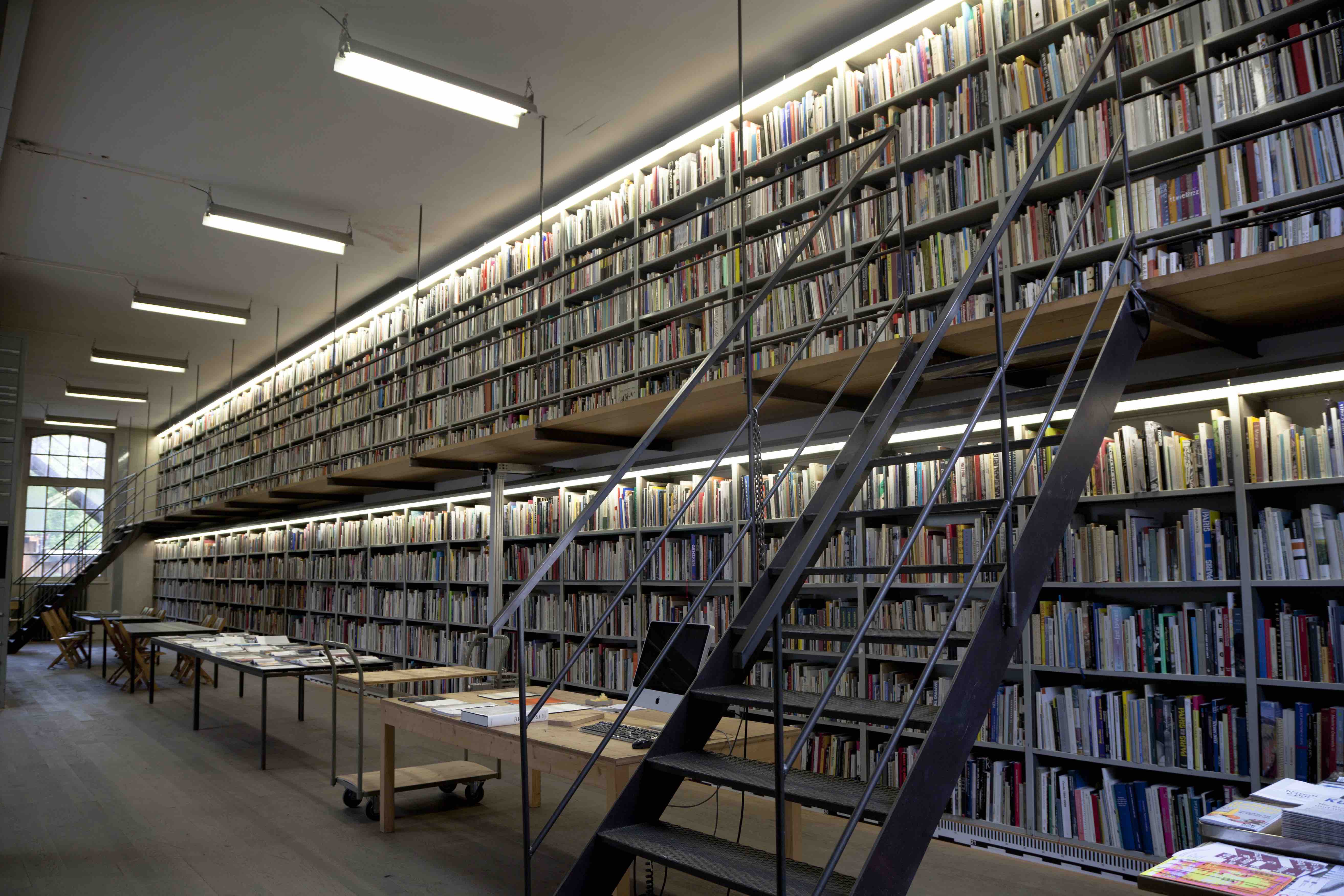 The Sitterwerk library is administratively connected to and located within the same complex as an art fabrication foundry, the Kunstgiesserei, which is located in a small valley, called the Sittertal, along the Sitter River. The repurposed complex of buildings were previously a site used by the local textile industry. The Kunstgiesserei has helped to fabricate works for a wide variety of internationally reknowned artists: Fischli/Weiss, Urs Fischer, Katharina Fritsch, and Paul McCarthy among others. The art library is accessible to the public in a 24 meter long room, the bookshelves extend along the full measure of the south facing wall. The other half of the room holds two offices, a bedroom for visiting researchers, and a nearly ceiling-high, custom-built filing cabinet system which stores a material archive. As the foundry is working with a variety of materials to help produce and restore statues and all kinds of contemporary sculptures, they keep this inventory of material samples that can be referred to when foundry craftspeople are troubleshooting a project in development, as aids in occasional workshops hosted by Sitterwerk, and for use in independent study for public users. The "book wall", has been architecturally designed to incorporate a bifurcation, effectively two levels, shelves which run along the ground floor and reach half way up the structural wall and an equivalent set of shelves running along a mezzanine that is accessible by stairs at either end of the room.