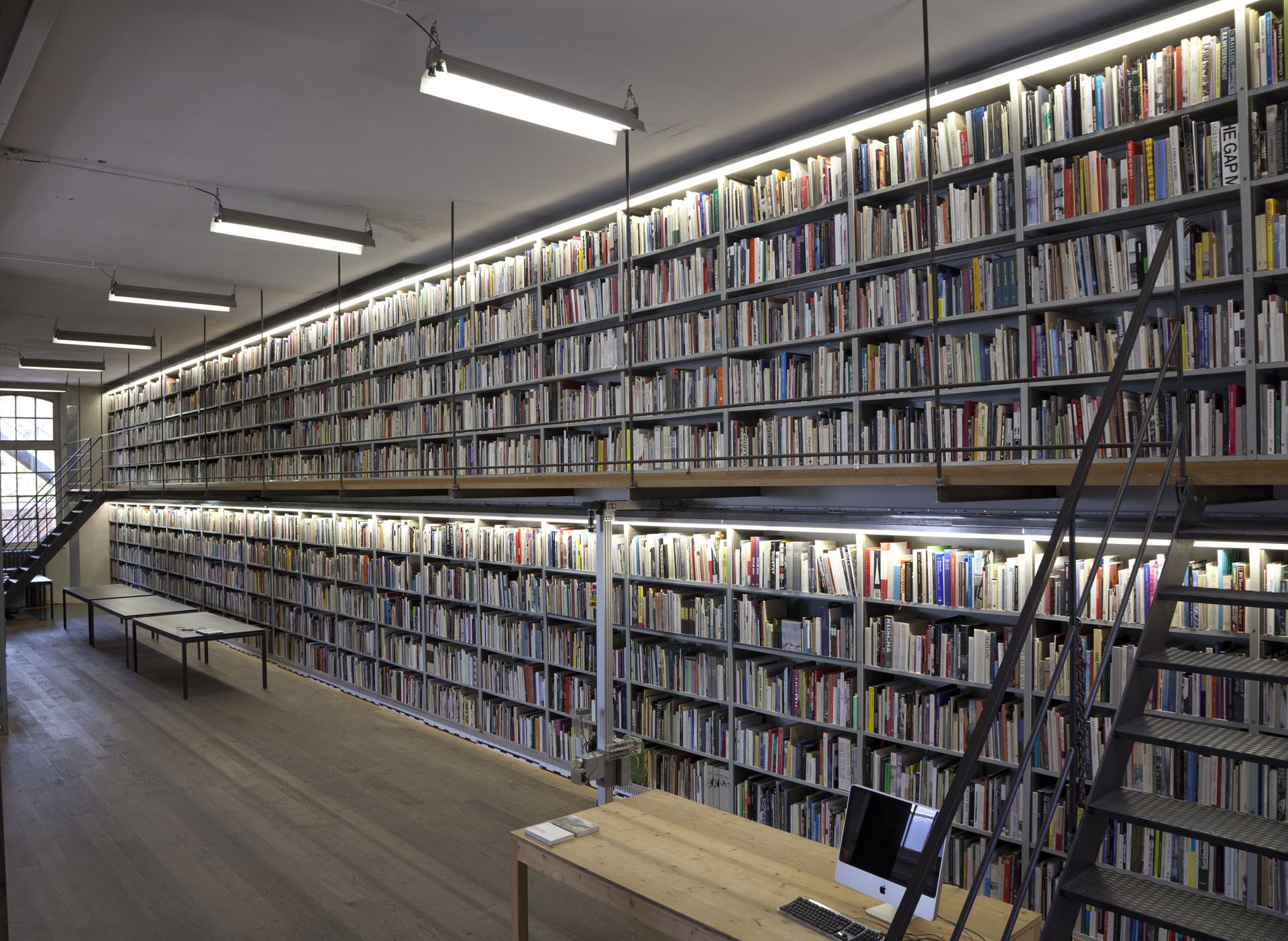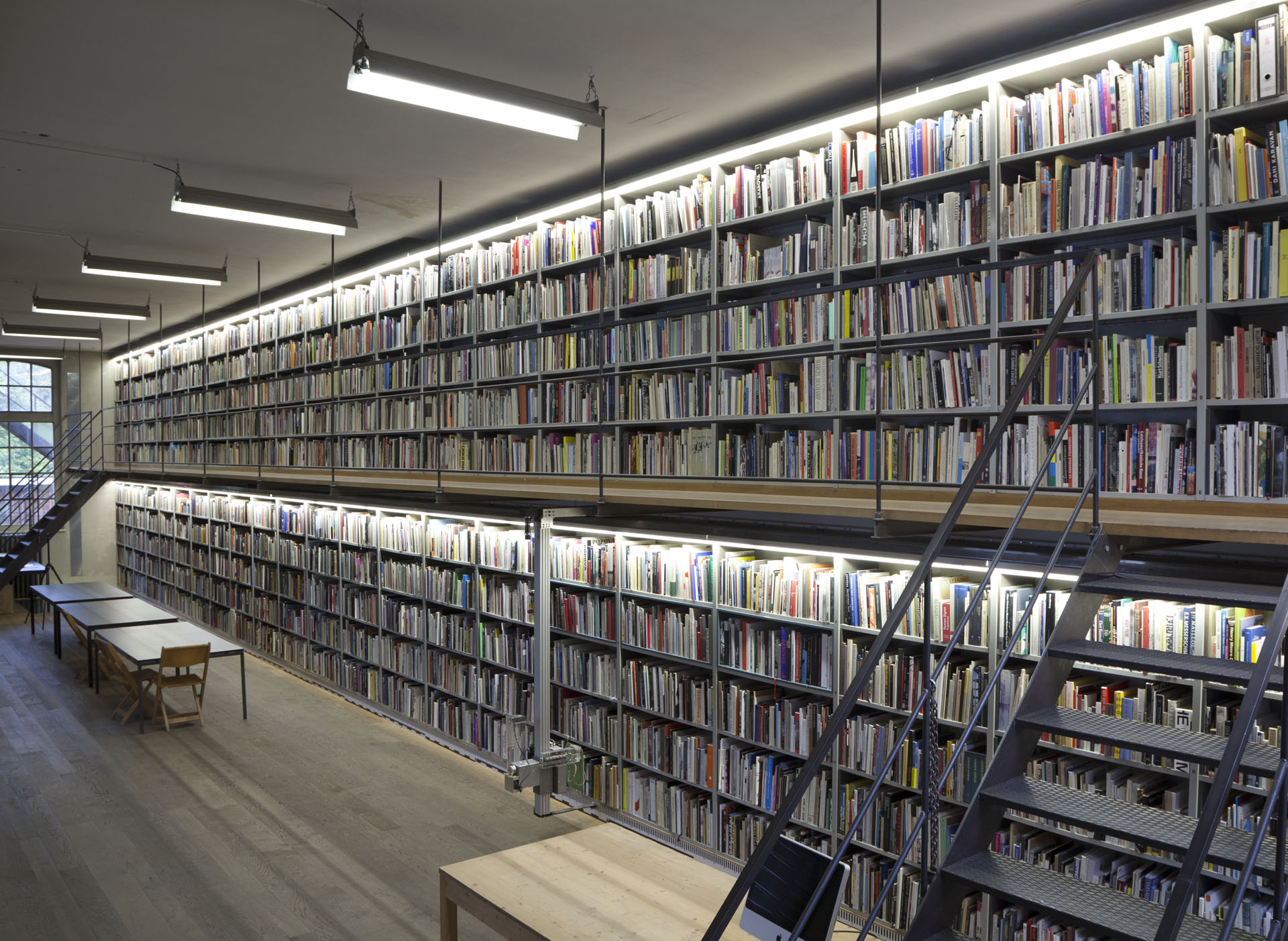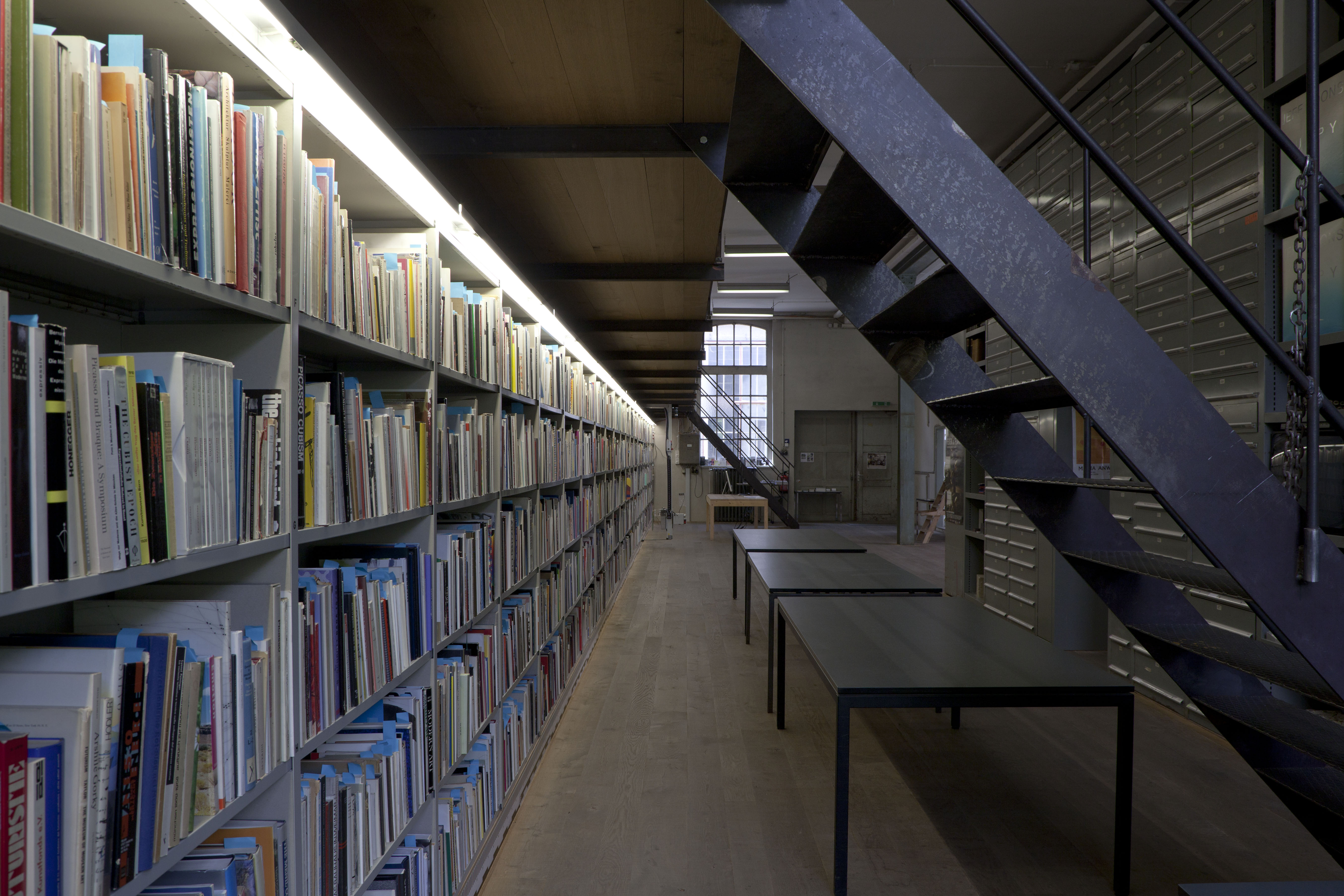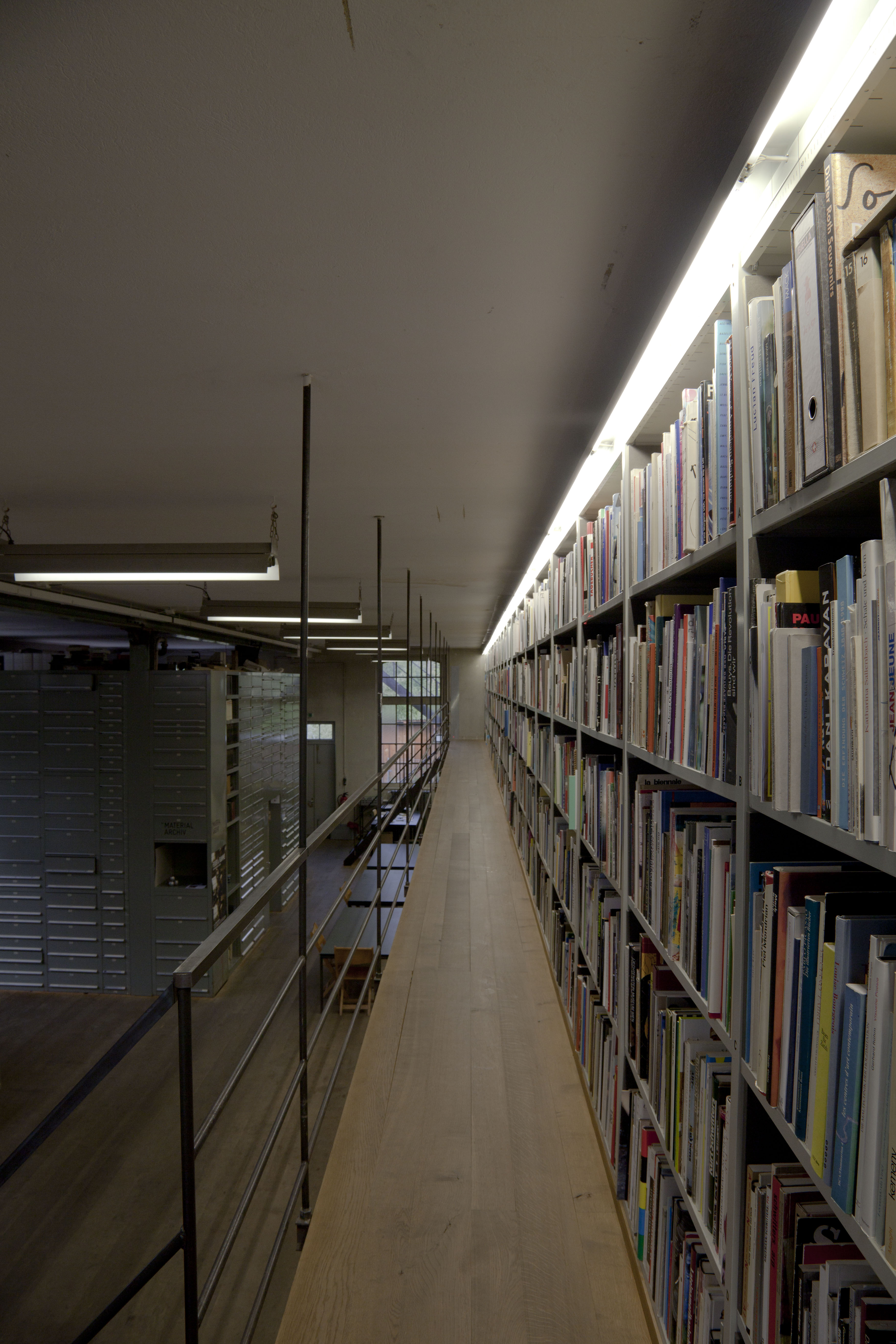 The Sitterwerk library is administratively connected to and located within the same complex as an art fabrication foundry, the Kunstgiesserei, which is located in a small valley, called the Sittertal, along the Sitter River. The repurposed complex of buildings were previously a site used by the local textile industry. The Kunstgiesserei has helped to fabricate works for a wide variety of internationally reknowned artists: Fischli/Weiss, Urs Fischer, Katharina Fritsch, and Paul McCarthy among others. The art library is accessible to the public in a 24 meter long room, the bookshelves extend along the full measure of the south facing wall. The other half of the room holds two offices, a bedroom for visiting researchers, and a nearly ceiling-high, custom-built filing cabinet system which stores a material archive. As the foundry is working with a variety of materials to help produce and restore statues and all kinds of contemporary sculptures, they keep this inventory of material samples that can be referred to when foundry craftspeople are troubleshooting a project in development, as aids in occasional workshops hosted by Sitterwerk, and for use in independent study for public users. The "book wall", has been architecturally designed to incorporate a bifurcation, effectively two levels, shelves which run along the ground floor and reach half way up the structural wall and an equivalent set of shelves running along a mezzanine that is accessible by stairs at either end of the room.