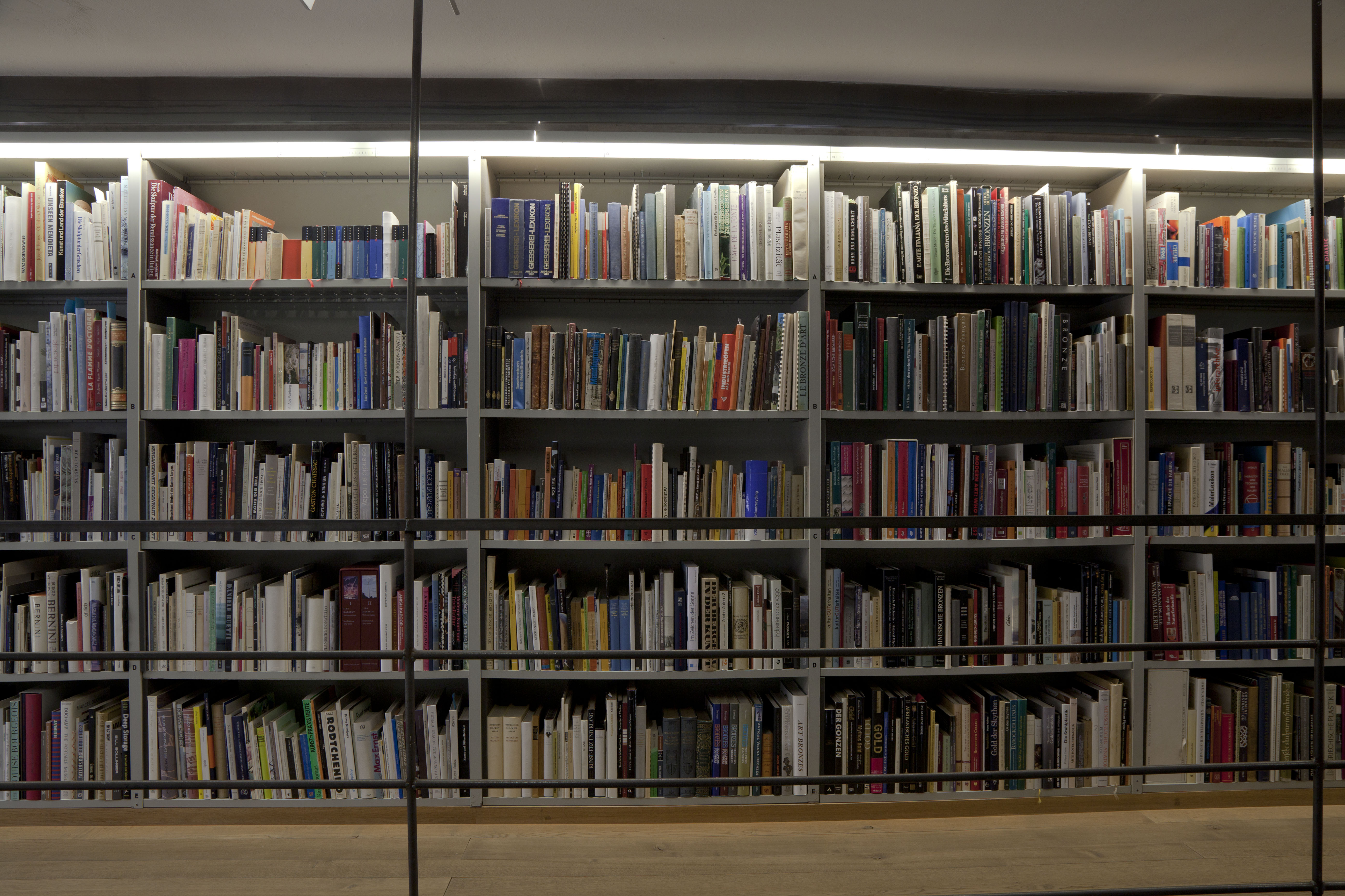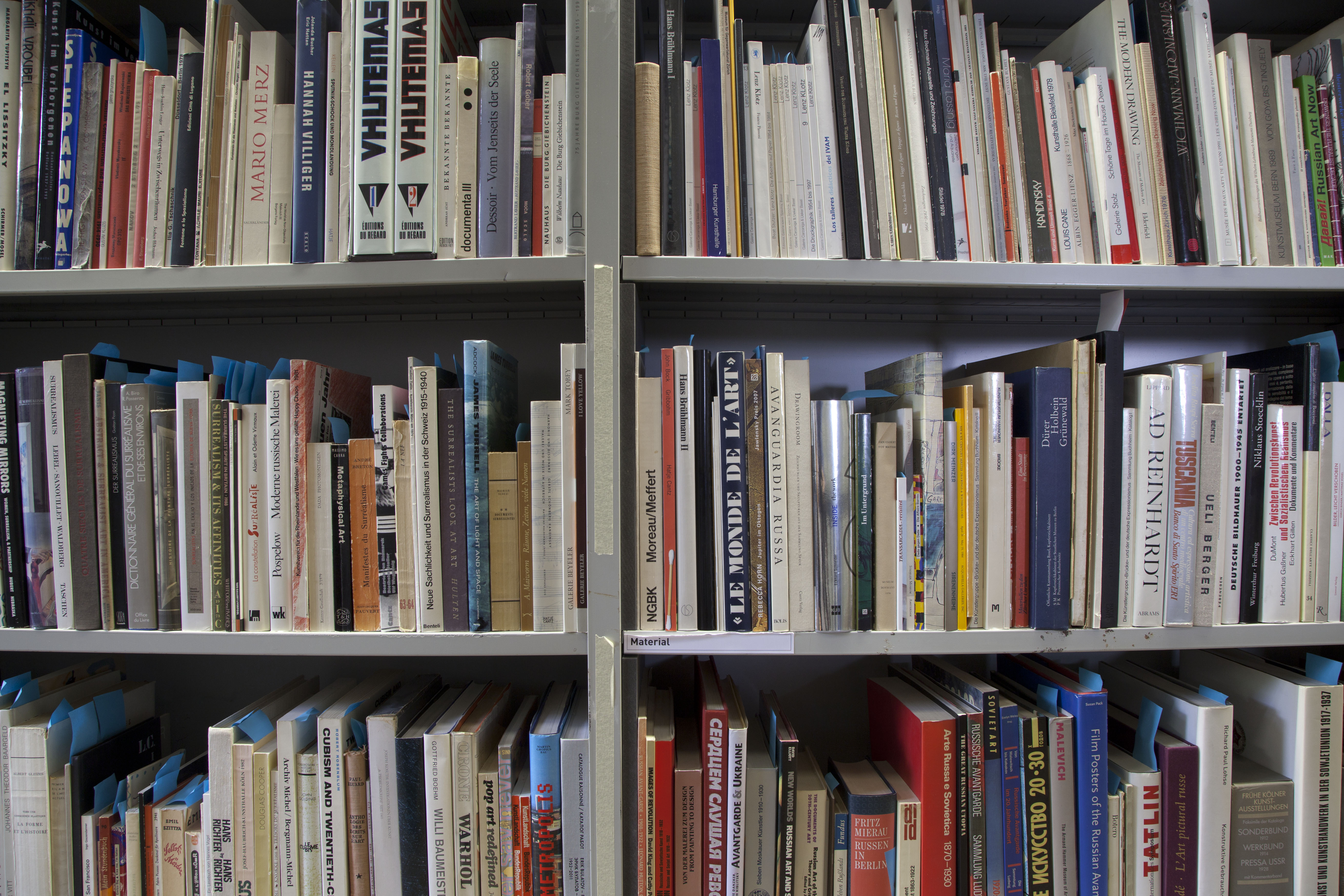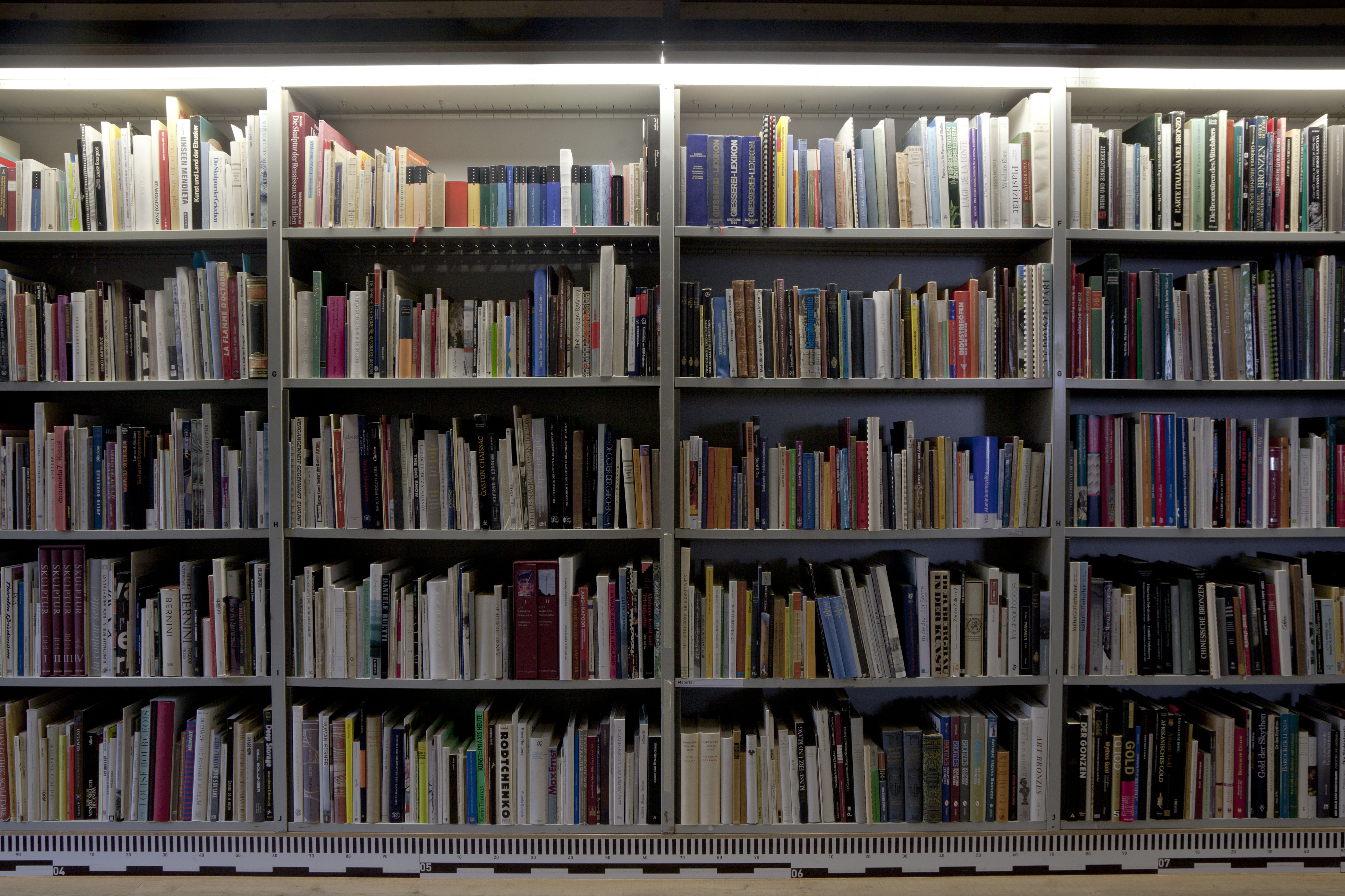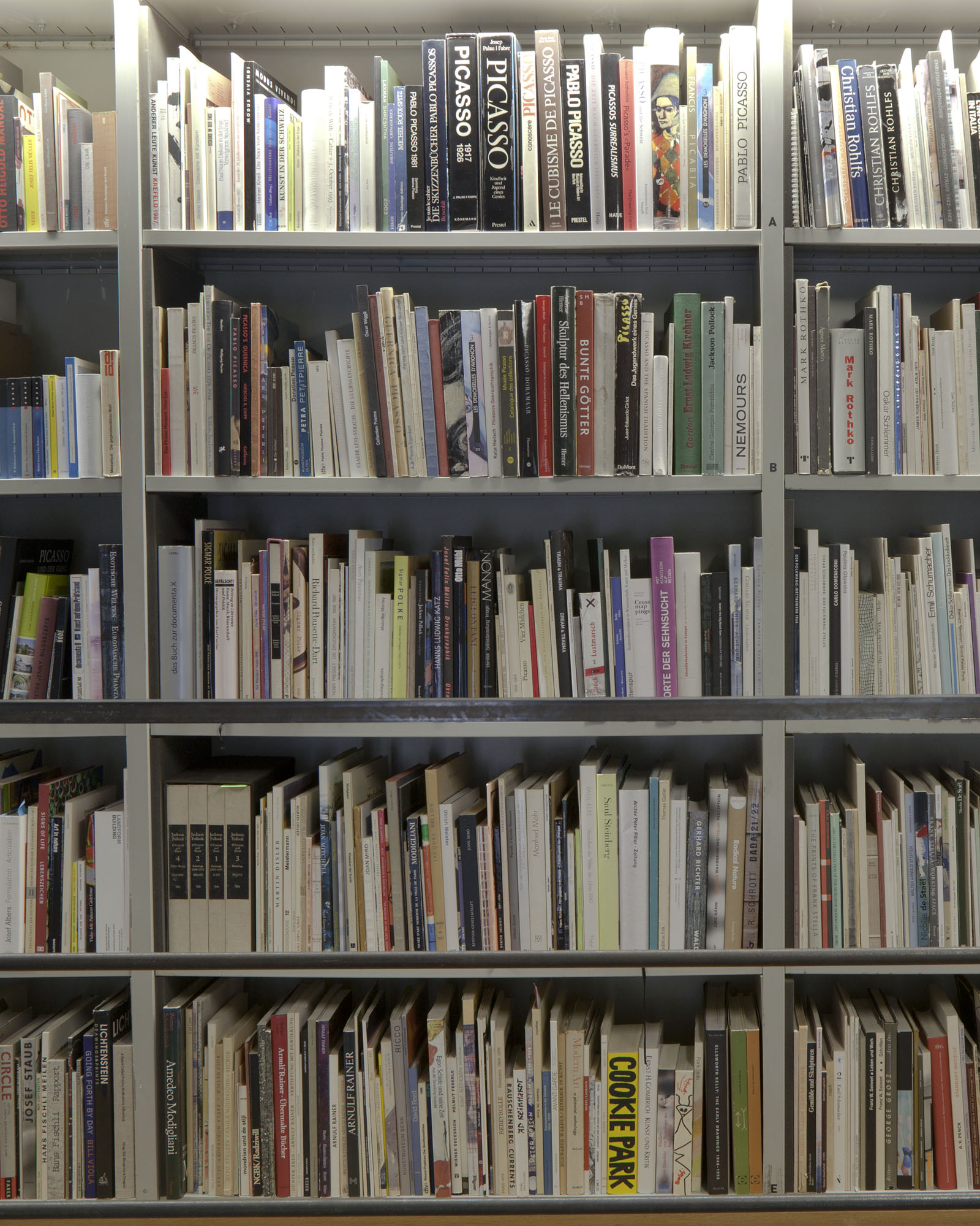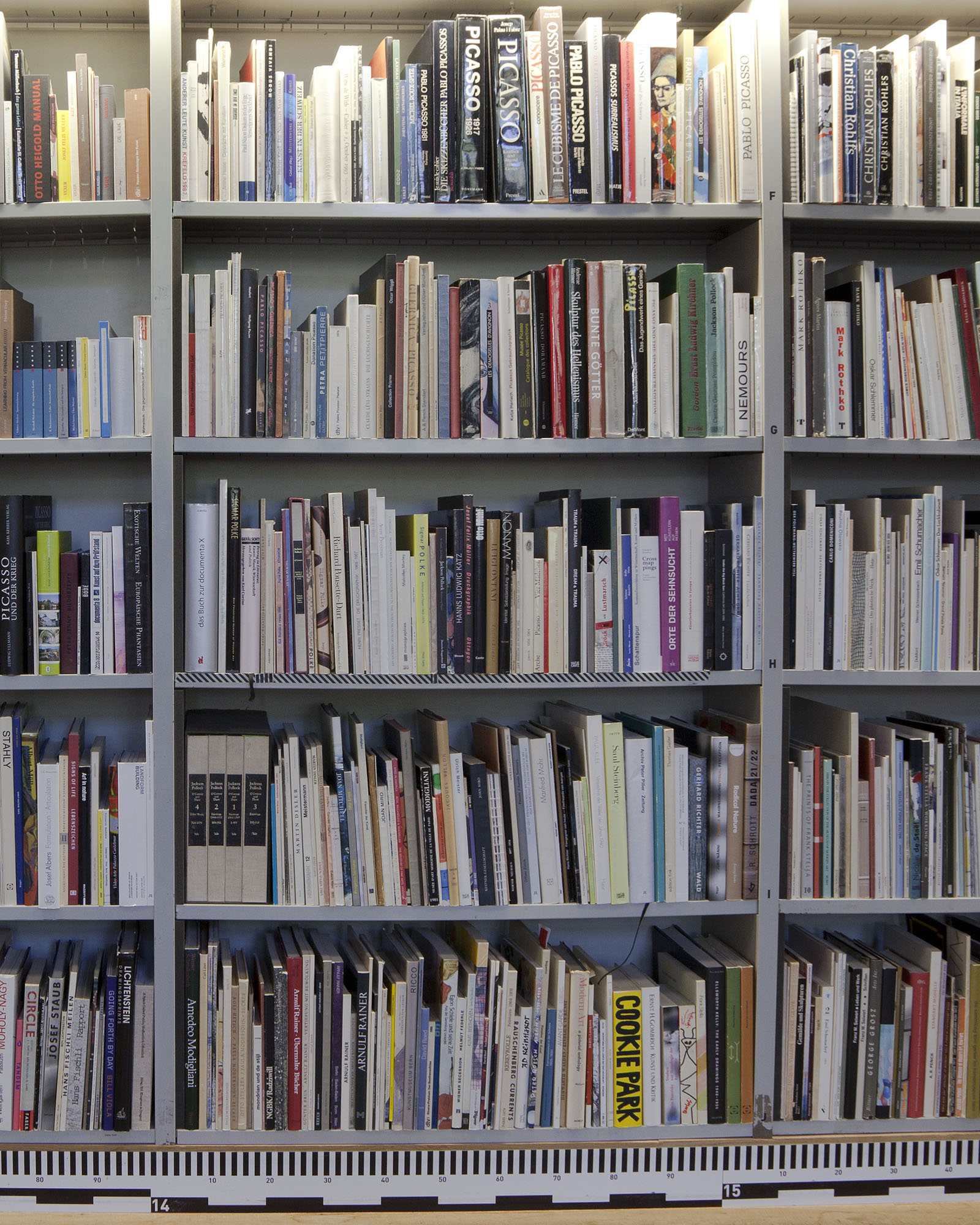 As previously noted, the mezzanine level contents move around less than their ground level counterparts. To be clear, there were areas on the mezzanine which have not entered the process of mixing between the library's start in 2006 and 2014. Moments when a number of Mark Rothko books on the mezzanine are next to each other on a shelf is a representative of an older alphabetic order utilized in the library before the RFID system was installed. Why have these books not moved in all this time? This could be due to a number of conditions: It could be that Mark Rothko has not been a useful name for people using the library; Rothko may not be a subject of research in the last years. It could be that because the Kunstgiesserei is focused on sculptural forms and due to this the most frequent use of the library has been concentrated in what could amount to a history of sculpture.