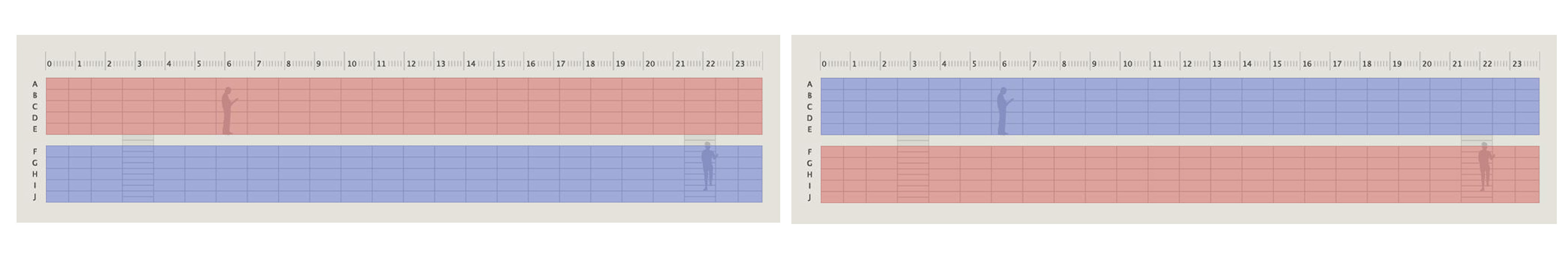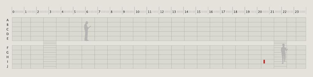 My proposal involved a rotation of the library's contents. All the books that were then located on the mezzanine level shelves exchanged places with all books on the ground level shelves and vice versa. This means that while all books moved up and down one level vertically, they maintained their exact horizontal positions along the wall. For example, the bottom row shelves running along the 24 meter ground level became the new bottom row on the mezzanine level, et. al. Importantly, this rotation did not disrupt the horizontality of any recent groupings arranged by library users, like in the example of twenty books previously posed, which seemed to be limited mostly to the curation of a single shelf. These curations are premised on personally organizing a (horizontal) shelf of books and thus the proposed rotation did not interrupt any intact arrangements.