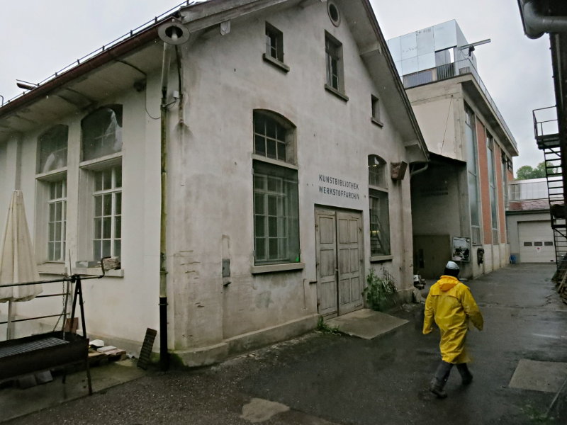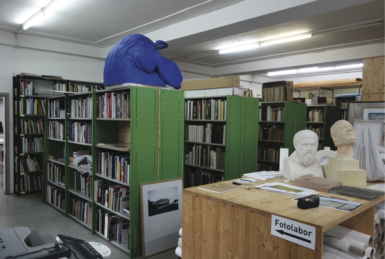 It is not possible to neglect the close proximity of the art foundry, both in its geographic adjacency and in its organizational relation to Sitterwerk. Here is a space where artworks move from an abstract concept to a concrete materiality. This space itself is not an exhibition space but a point of process before something enters one. Artworks made there are quite often sent directly to these exhibition spaces in the next phase of a processual provenance. There are some books now in the library which have documentation of artworks produced in this very foundry. This indicates some form of return in what could be considered this typical linear progression of acculturation. Following the development of an artwork in a process places the exhibition not as the end of production or the thing in-itself. It is only a momentary pause somewhere in the middle. The image of the Lager with the Katharina Fritsch blue cock's head provides an interesting alternative to the seeming extremes of material production and analytic digestion.