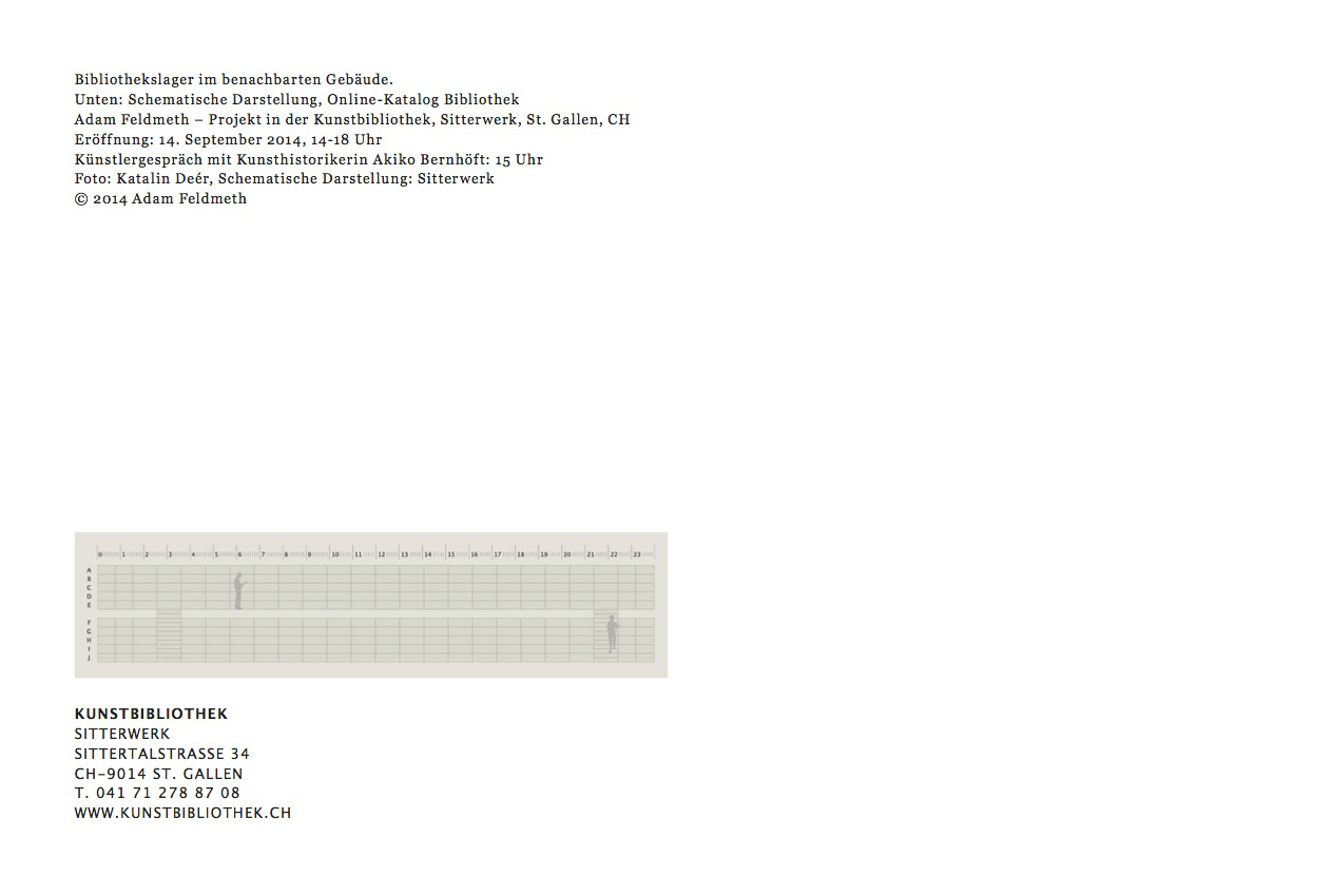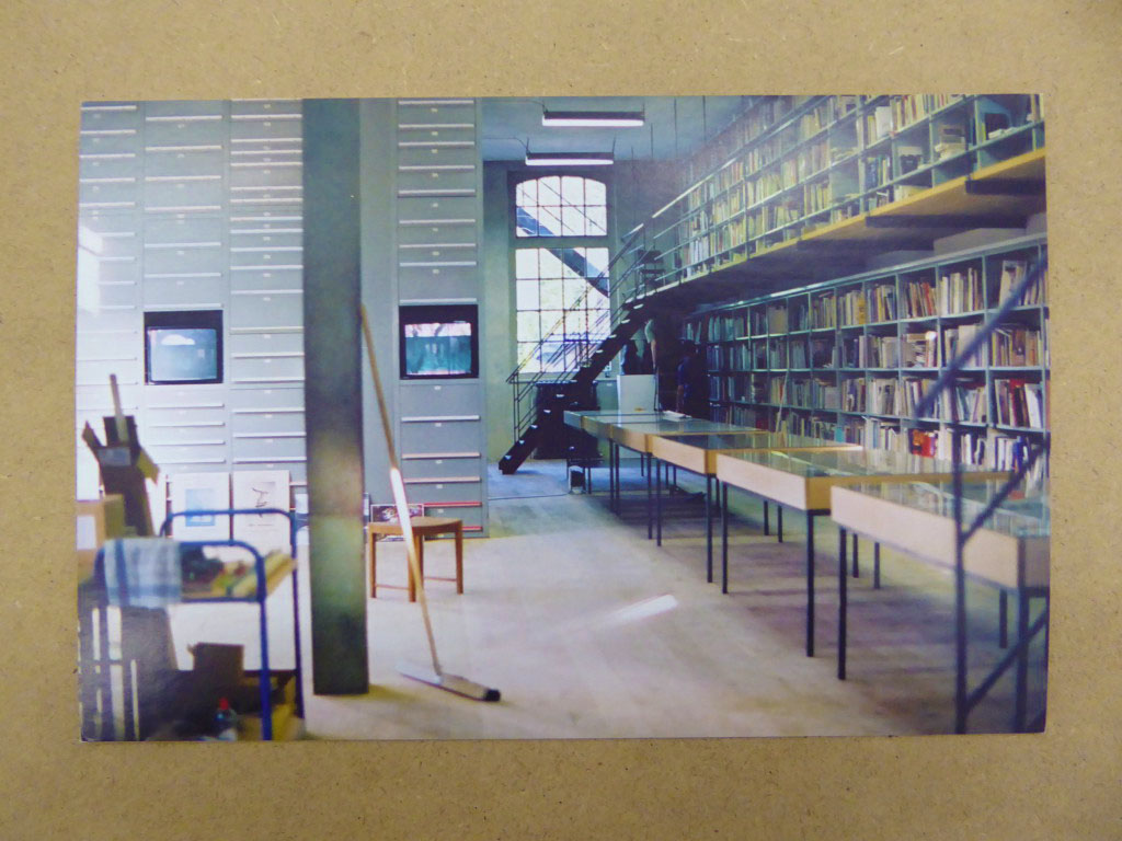 A postcard depicting library storage, the Bibliothekslager, accompanied the rotation. The placement of the image onto the postcard is an abstract movement itself as well as an acute inquiry. The textual backside of the postcard presented information which identified the location of the frontside photograph with additional information expanding upon access. The image represents all books in the library's collection that did not fit within its shelves effectively rendering them excluded from a dynamic order and public access. At the time of the rotation and upwards of half of the entire collection was housed in this storage space in another building located in the Sittertal complex.