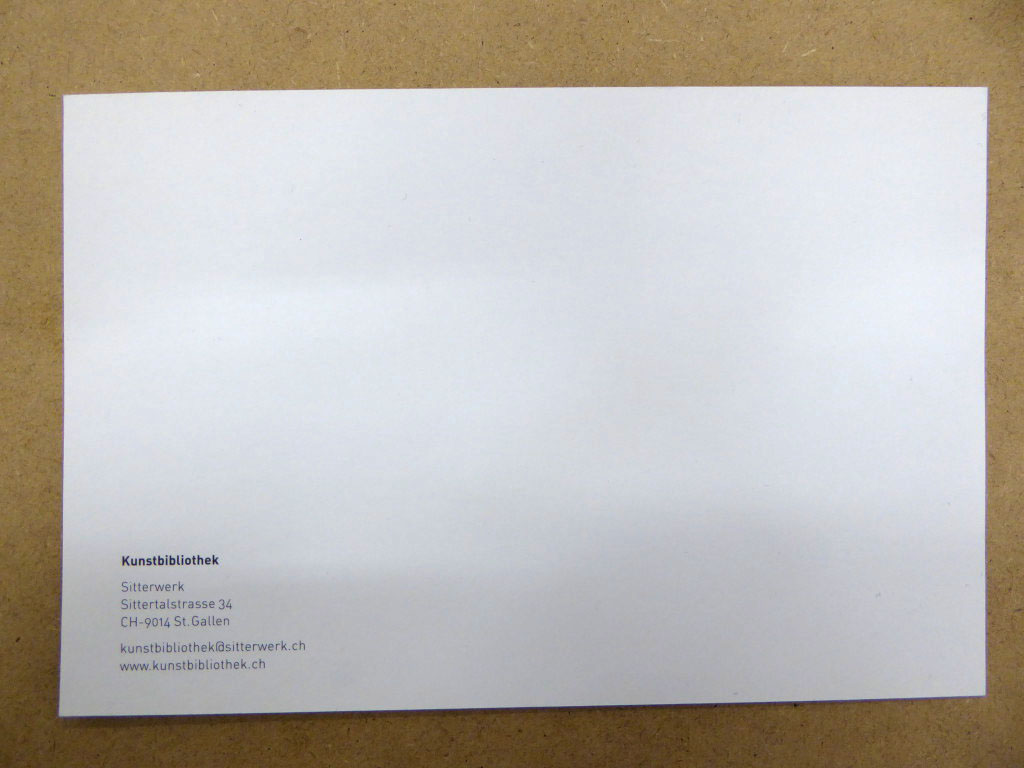 The right half of the postcard was left open of any printed information. If a person wanted to send the postcard to someone else by post, it was entirely possible, though the design did not explicitly encourage this. In other words, the postcard functioned as advertisement for the Kunstbibliothek within Sitterwerk and the project while also as an object of tourism when dispersed throughout neighboring libraries within St. Gallen. How it was used after by individuals remains a question of such ephemeral production. Perhaps used as a bookmark to hold a page in a book.
