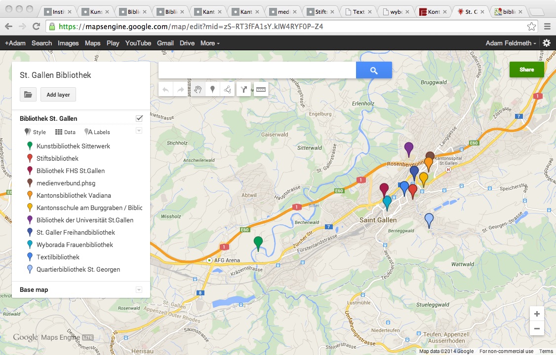 Library locations listed by the "Buchstadt St. Gallen" organization helped to determine what additional library locations the postcards we installed within. Buchstadt St. Gallen is an organization invested in enriching the cultural presence of the city within the greater region and country of Switzerland through acknowledging a long (1,200 year) historical relationship to book keeping. The interests of this organization are connected to promoting the city as a tourist destination. It is this reality that Buchstadt St. Gallen operates as a part of the local tourist industry.