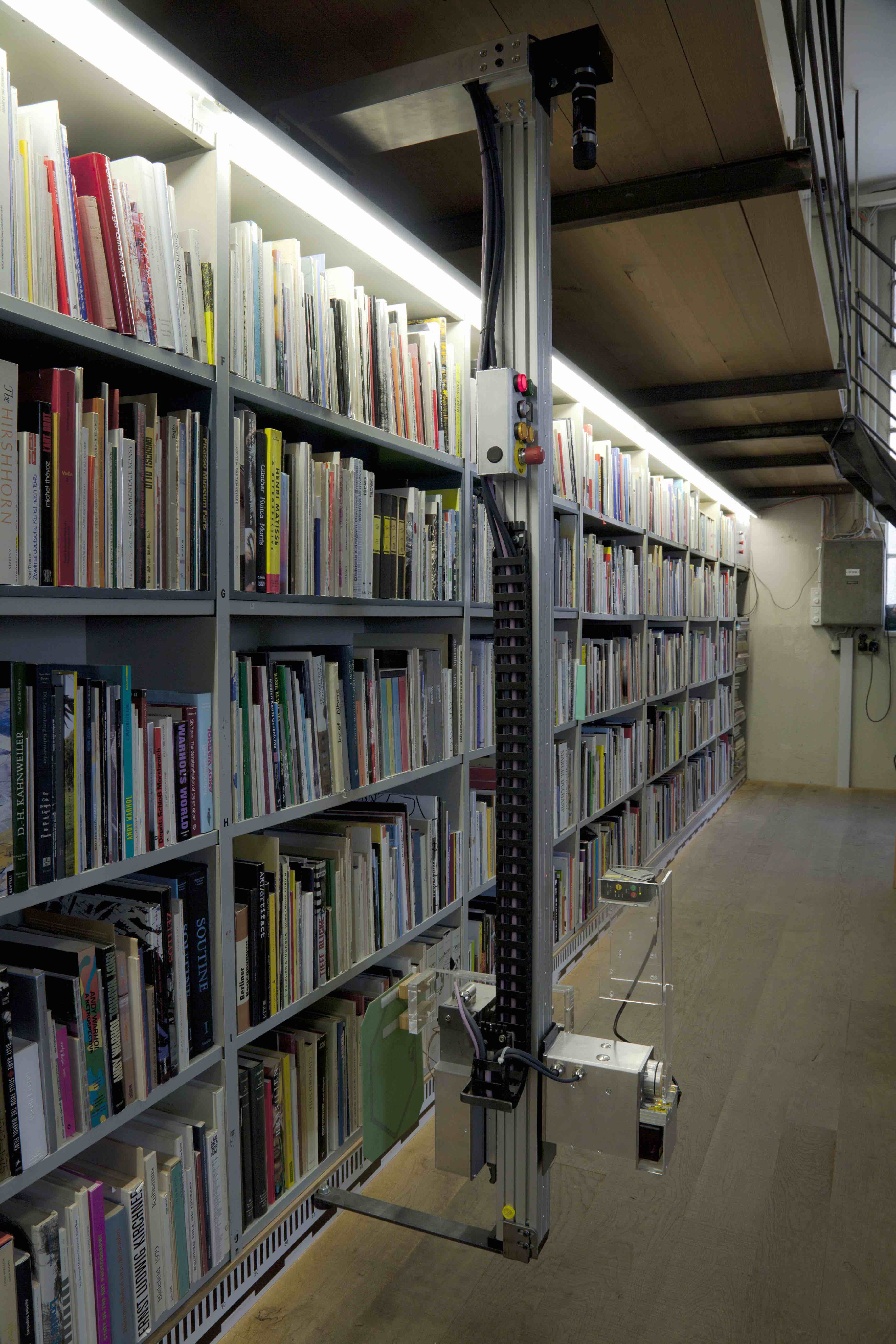 The project involved considering an unique system that this library has developed to distinguish its organizational premise directly through active public use. In an effort to encourage chance findings among the shelves when an individual may be in search for a specific title, "intelligent tags" have been installed inside each book. These tags are tracked by radio frequency. This allows the spines of the books to remain uninterrupted by the stickers and labels common to many library books. To track the visible collection, each level of the library is equipped with a device carrying a receiver for this radio frequency identification technology (RFID). The "RFID-reader" is attached to a mechanical guide which scans the wall of books daily, recording the position of each tagged book and its location in the bookshelves along the wall. What this creates is the possibility to place a book anywhere on the shelves after study irregardless of any specific shelf where a user drew it from.