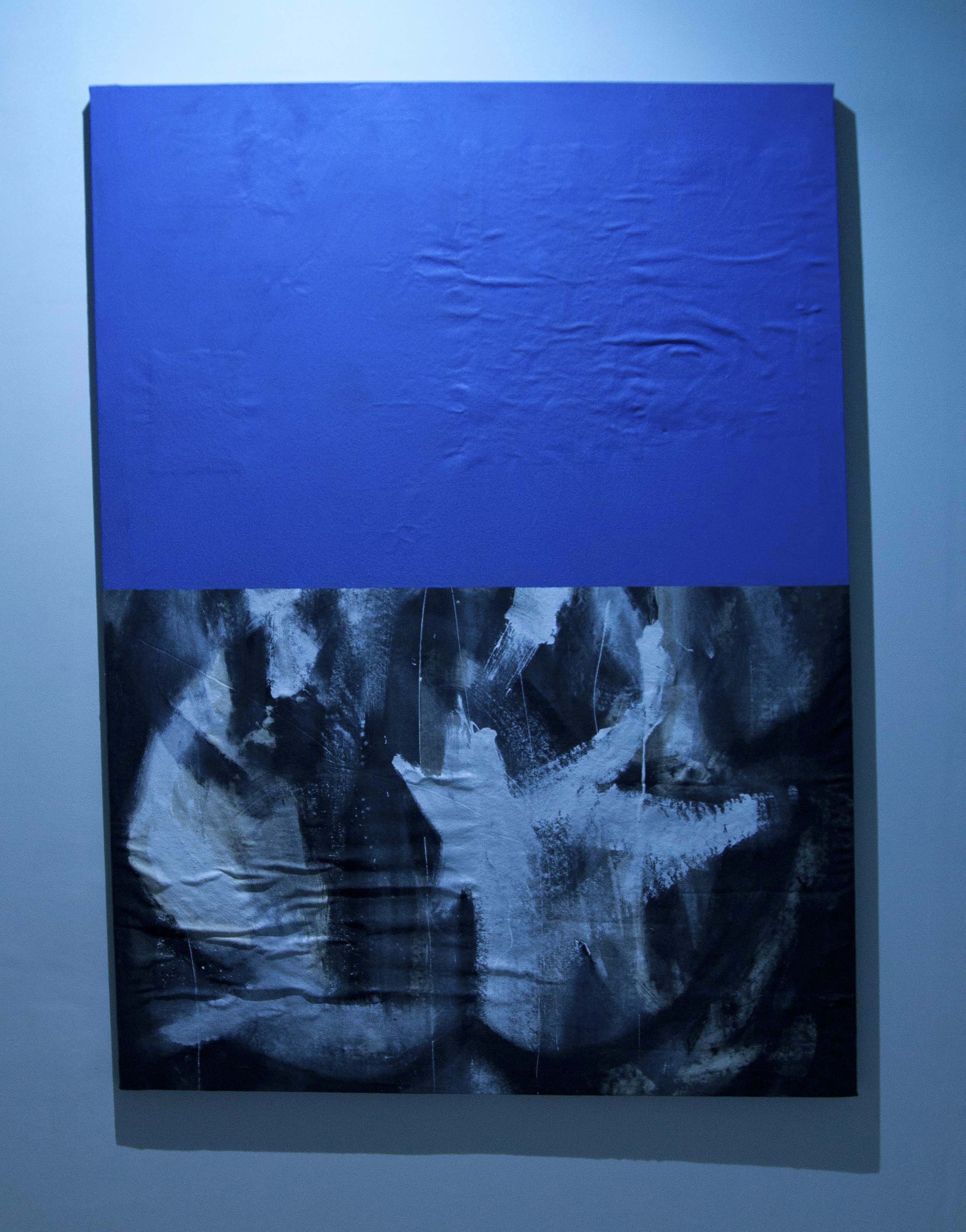 Although the provision of this unstretched canvas among the larger donation to Wrinkle was not contiguous to scroll, I contacted him and asked if he had a painting from this set that he would be willing to lend for its display in this context. He obliged. Entirely by coincidence, the painting he subsequently provided had been augmented by a coat of monochromatic blue applied to its upper half. This alteration constituted his painterly negotiation with the previous unstretched, painted canvas provided to him. The outcome left the bottom half of the canvas untouched, exposing the painted marks now receded underneath the blue upper. Having never visited the venue before, this display of the painting, and Wrinkle's choice of blue was startlingly in-tune with the curatorially rigid lighting fixtures.