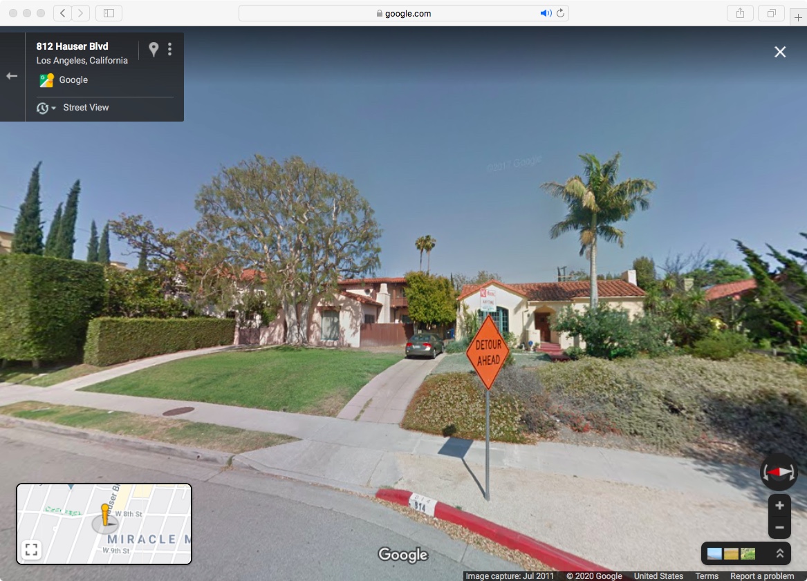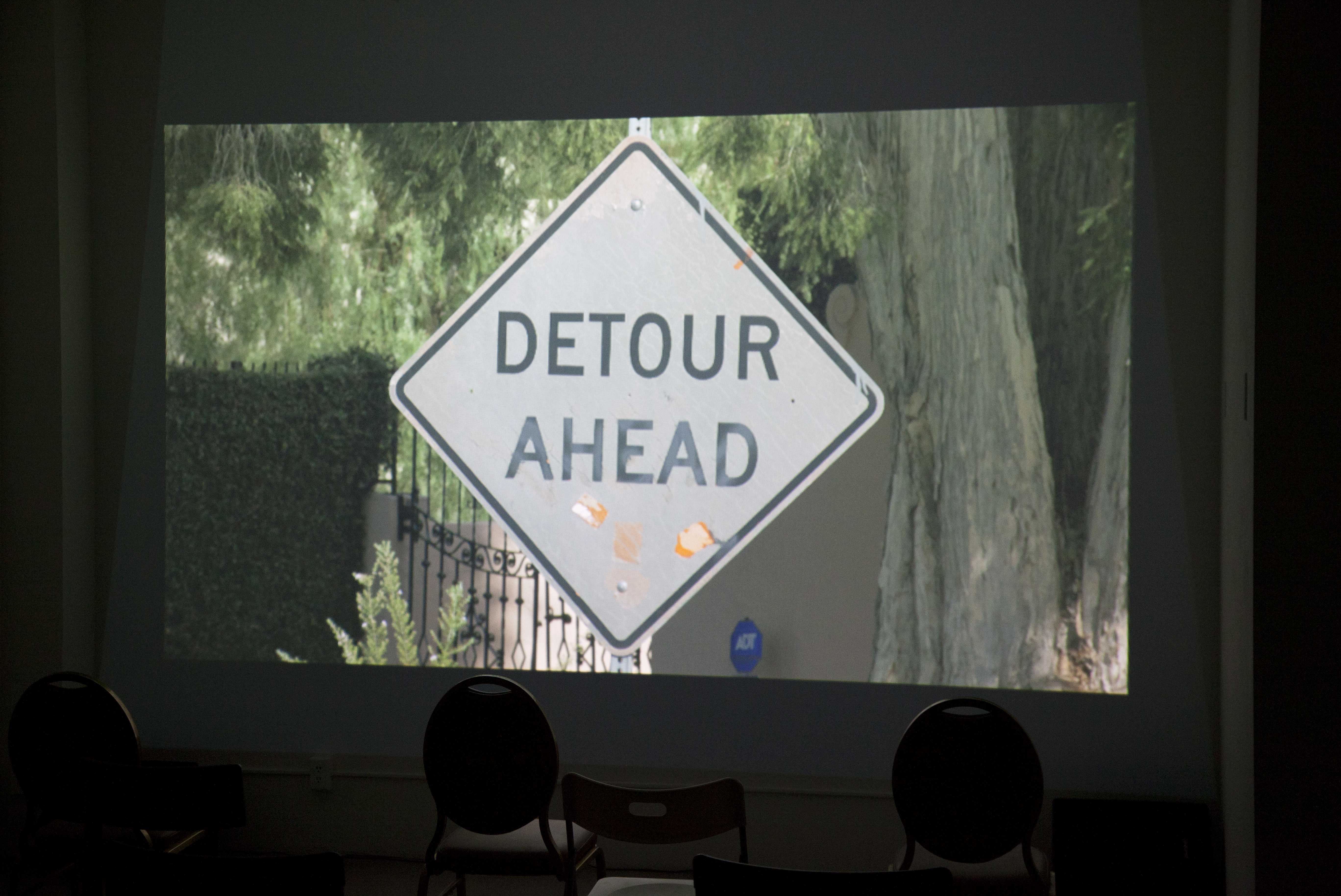 The parkway, while technically the domain of the city, a gray zone between public and private in itself, where the central sign of the film is installed, falls within the extended scope, to curb, of one property's numerical jurisdiction. By contrast, the angle it is positioned at which the camera directly paralleled (faced) placed this sign staked in the parkway from across the road, at curb's edge, as framed in front of the property adjacent. The exact angle of the "DETOUR AHEAD" sign, evinced by the paired camera to it, was exposed to being not wholly practical for passing drivers.
