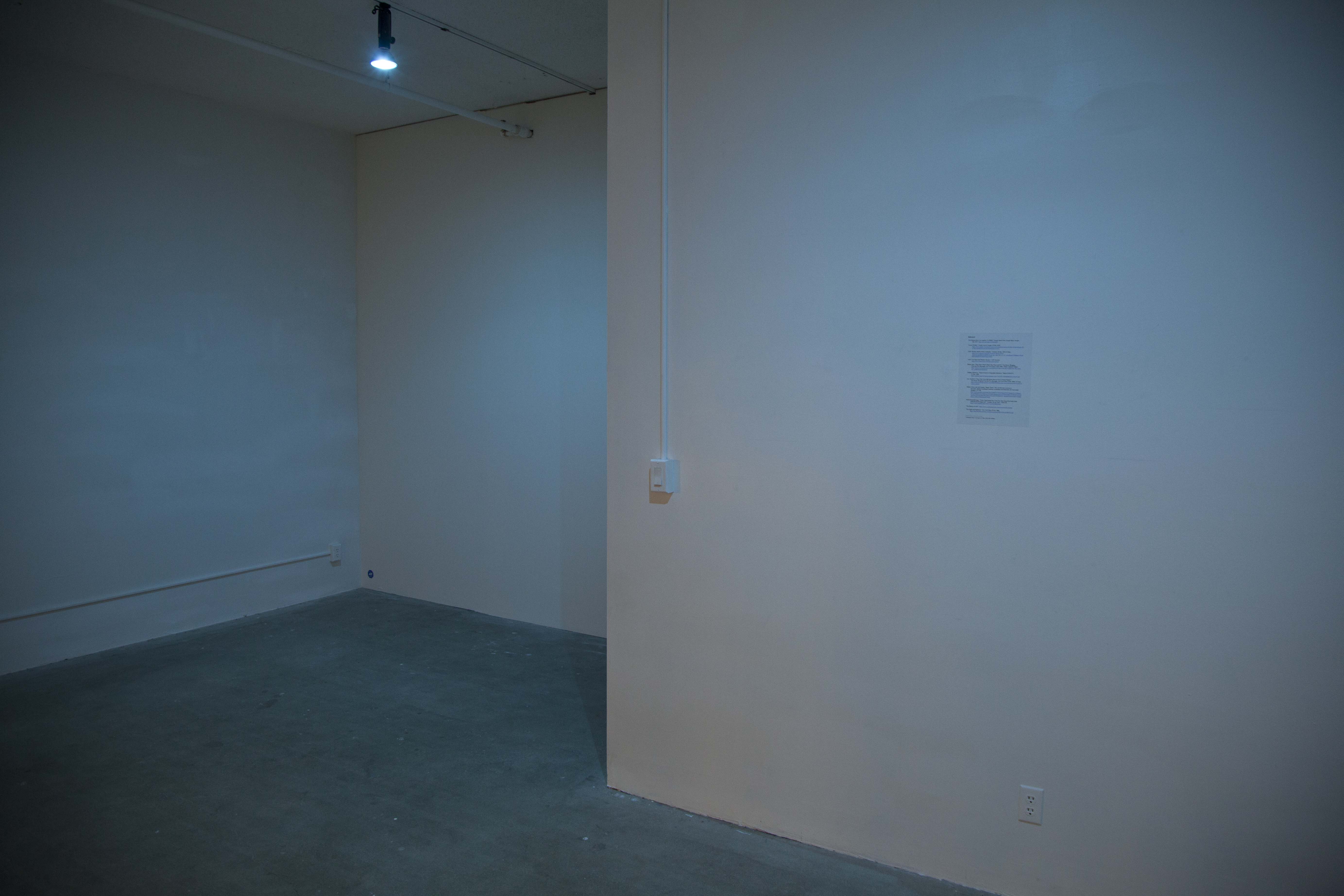 On a preexisting partition in the room's internal entrance space lit by the third blue light fixture, a single printed page of bibliography listed hyperlink references. This document provided acknowledgment of research contributing to the varying aspects of my contribution to part ii. The 8x11.5" page was spray mounted to the wall, on-center, right of the sole light switch that controlled all three fixtures in the space. The text was set in Times, 12 point, black font. Due to its printed state, the discernible hyperlinks set in blue underscore, though symbolically recognizable as active, non-static text, were in this case compressed by the materialization of these references as ink on paper. By extension, this rendered them static.
