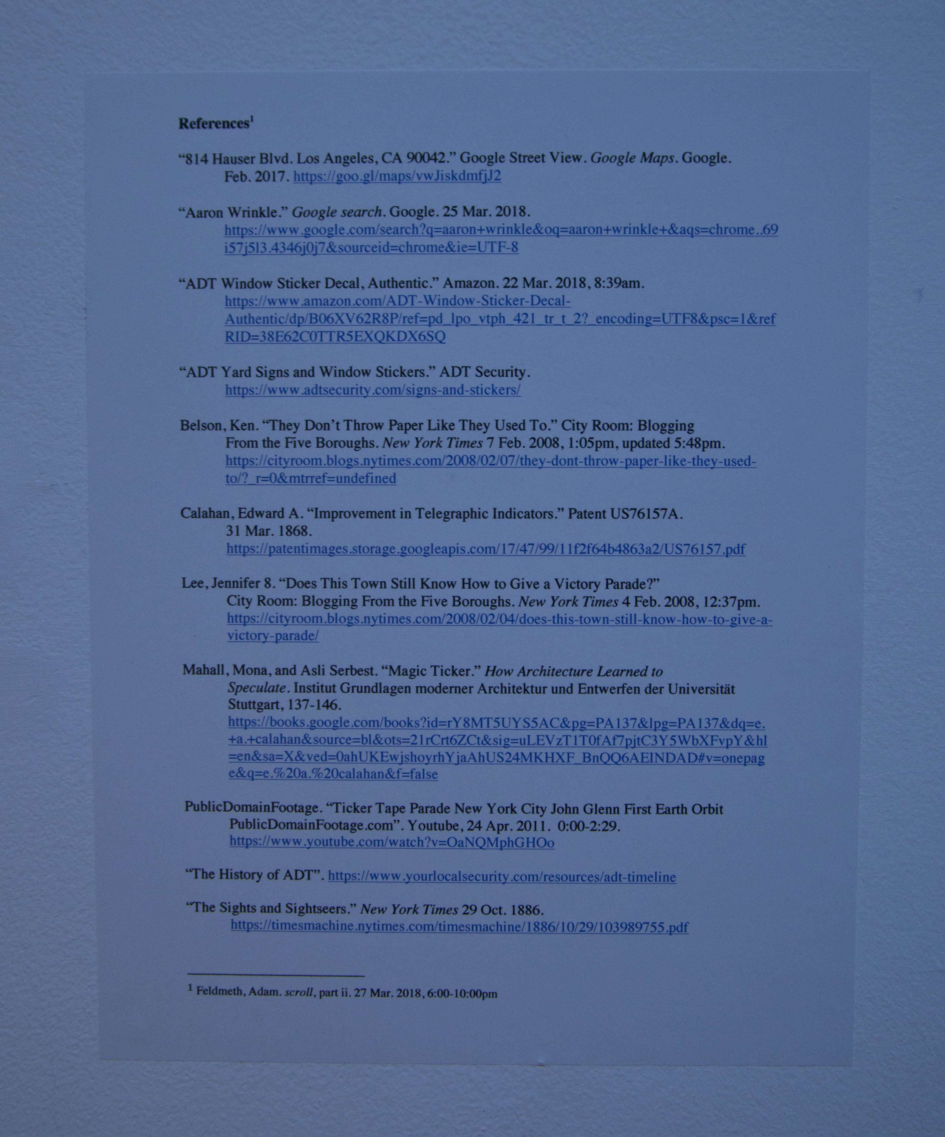 The third area of research took up an expansion of the very bibliography itself as an implied transmission of references elsewhere within the space. This group of references traced an alternate trajectory that mutually began with a major step in the invention of the telegraphy, patented by ADT's founder, Edward A. Calahan. These included: Calahan's Patent US76157A, which was filed in 1868 under "Improvement in Telegraphic Indicators"; an excerpt from the chapter, "Magic Ticker" from How Architecture Learned to Speculate by Mona Mahall and Asli Serbest, which historicizes Calahan as the inventor of the first stock telegraph-printer, or stock ticker; an article from 26 October, 1886 from the New York Times entitled, "The Sights and Sightseers", documenting the ad hoc genesis of ticker tape parades stemming from impulsive "stock boys" not warranted to leave their posts to enjoy the festivities at street level and yet so enthralled by the scene unfolding below that they grabbed the used ticker tape at their feet and began hurling it out the open windows of the Financial District high-rise to contribute some flair to the affair; a two and half minute segment from a youtube.com post of digitally transferred footage now in the public domain of a 1962 Newsreel of the ticker tape parade held in celebration of John Glenn's first earth orbit in which the voice-over narration notes the tape present in the shots was "thinner" than that used in earlier times do to strides in stock market machine technology [leading towards eventual dematerialization]; and two New York Times blog posts from February 2008 entitled, "Does This Town Still Know How to Give a Victory Parade?" and "They Don't Throw Paper Like They Used To", each noting that in the twenty-first century, the citywide victory lap in the U.S. context was looking more and more like a relic of the former century.