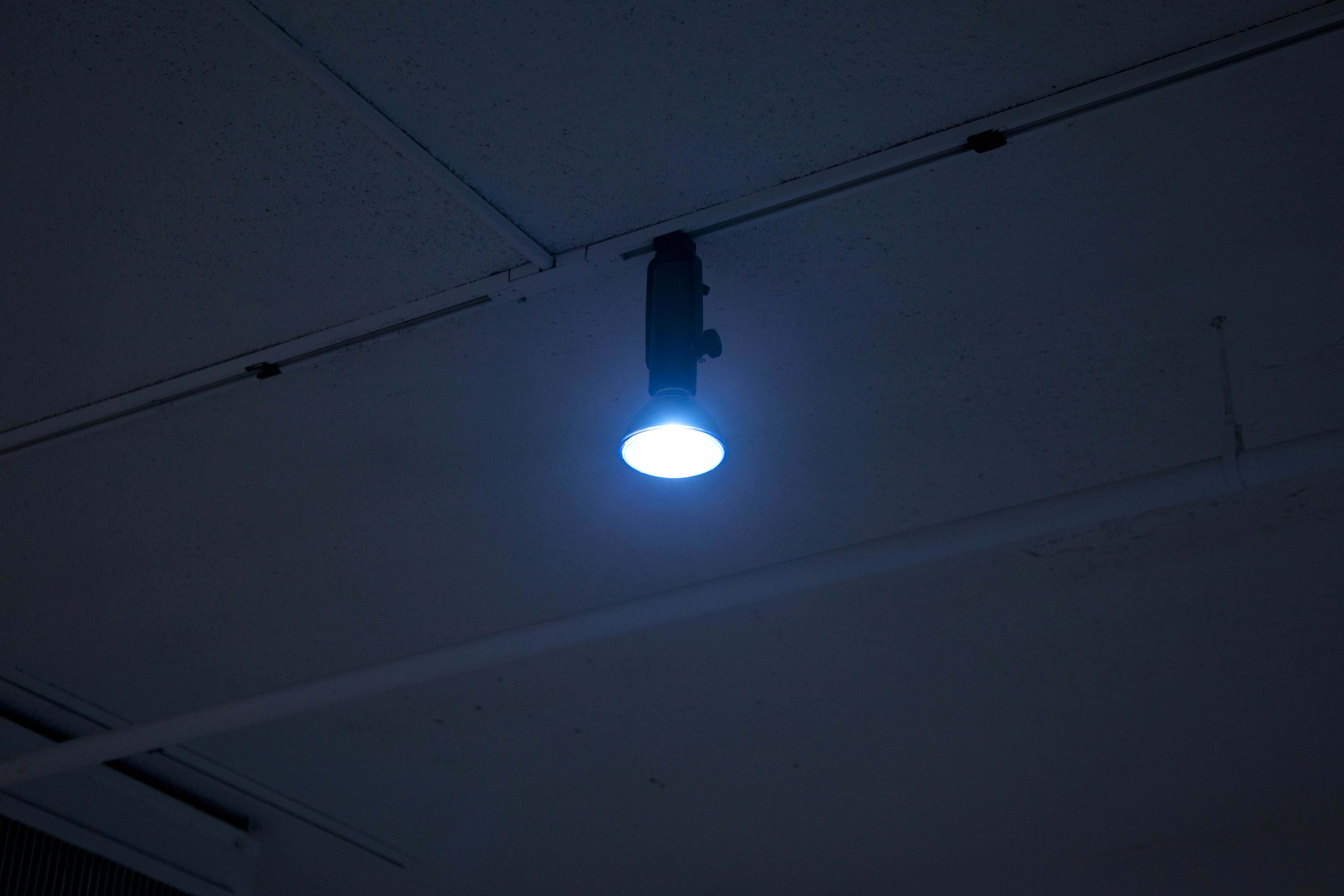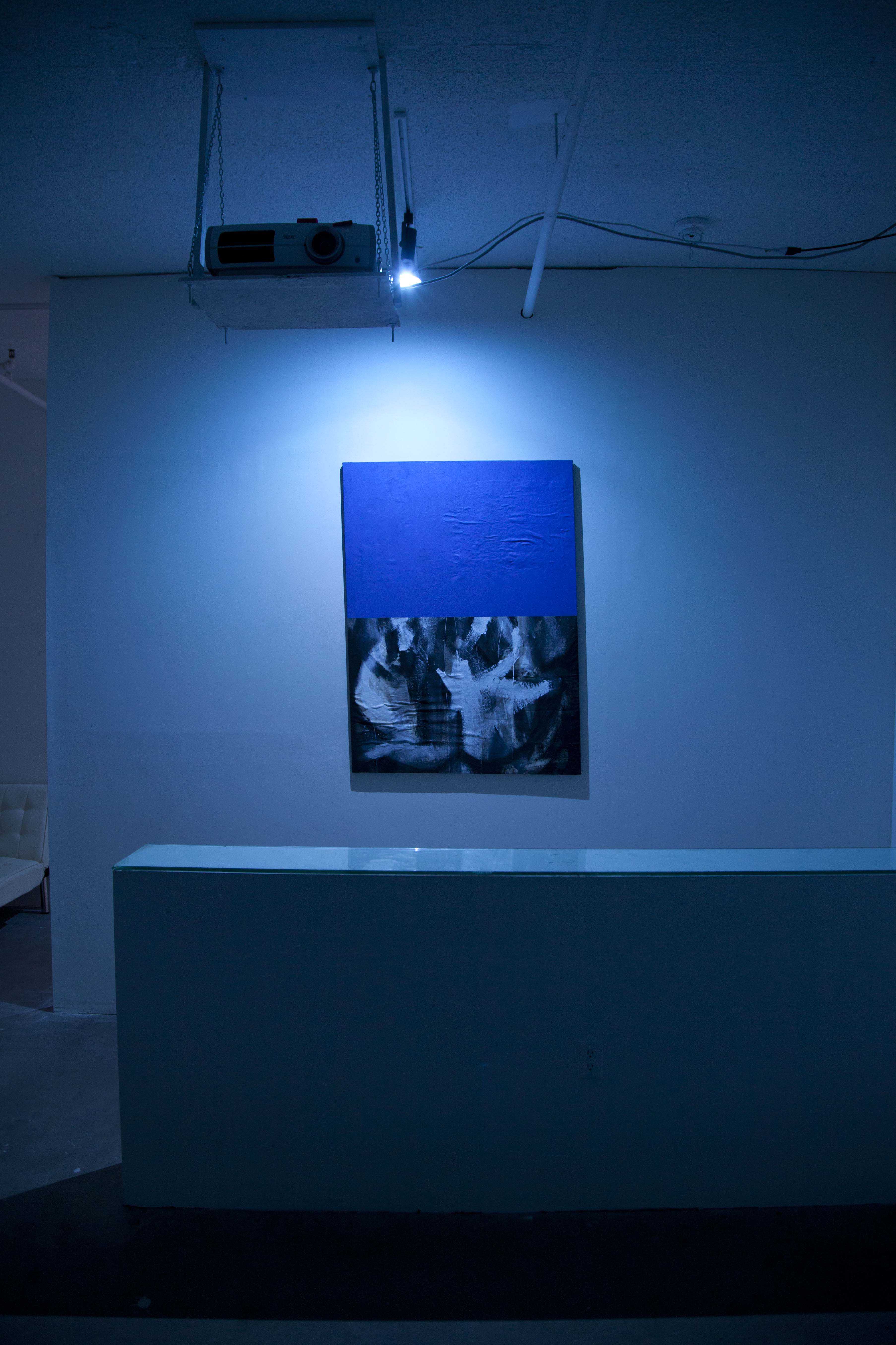 With the painting provided by Wrinkle drawing attention to the single blue light fixture mounted above it, two additional inclusions to the overall contribution to part ii emphasized the other two light fixtures in the space. Both were located in an otherwise emptied interior entrance space/anti-chamber within the room. This absent reception was due in part to the preexisting layout of the room coupled with the partition wall which privatized the series of events at a distance from the glass walled buffer into the florescent lit hall. In weeks where all paired contributions were self-contained in the recessed interior for screenings, this preliminary area, viewed from the hall, was devoid of signification that any event was occurring other than the interior lighting that cast the room in a blue glow.