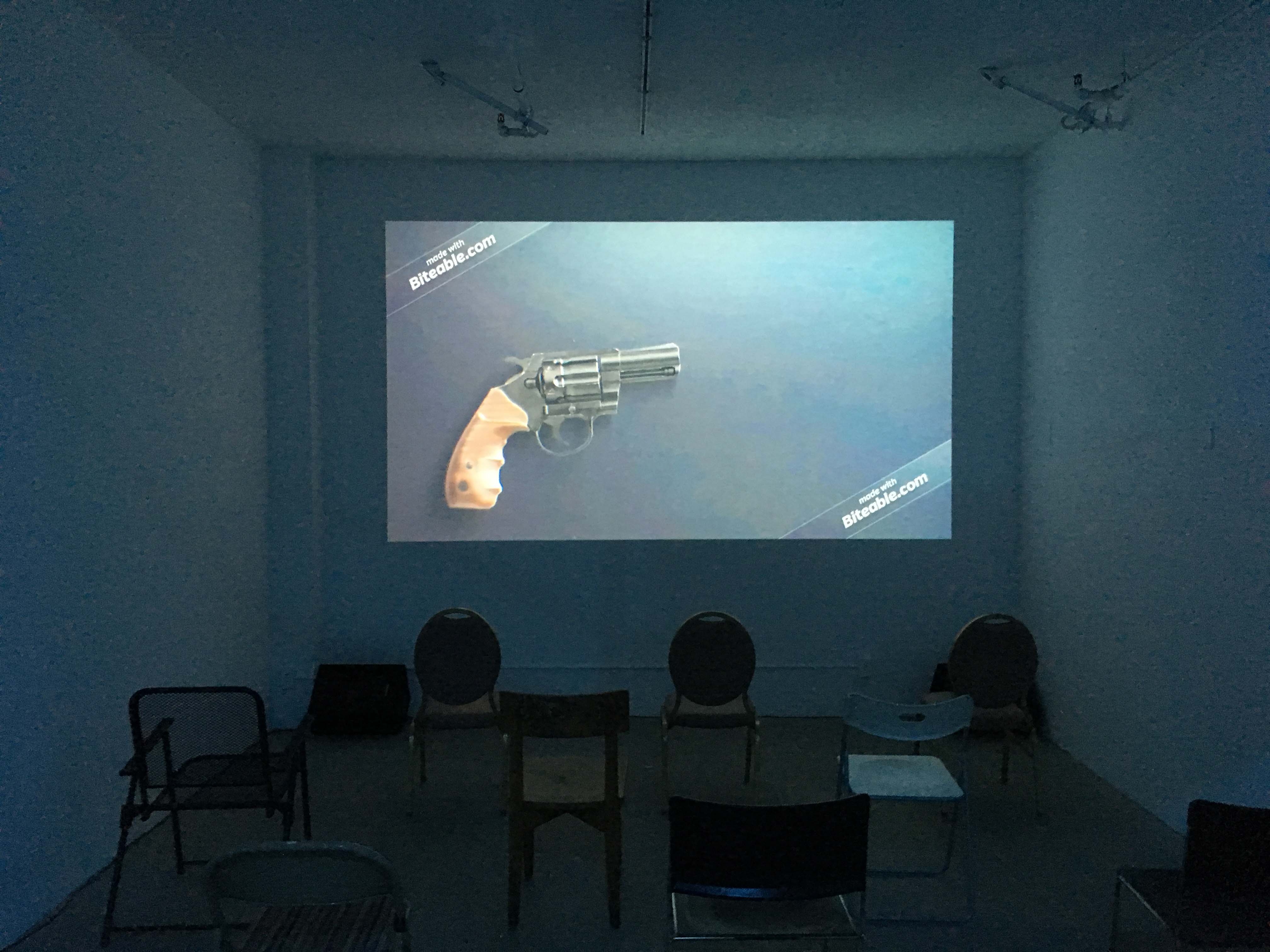 Upon entering the room, everyone who attended the March 27 event was personally sent a digital pdf version of the bibliography for non-static access to its contents, which could either perused while in the space or thereafter on devices at their leisure. If accessed while present, this delivered pdf, telegraphed to them by electronic means, would be received on mobile phones that invariably required one to scroll through the various bibliographic references, if not also touch the blue hyperlinks to subsequently scroll through these opened materials. The pdf on these smaller screens appeared as its full 8x11.5" format. Thus, in order to more clearly read and/or accurately access specific reference links through tapping the glass, an attendant would need to pinch-to-zoom in for greater discernment, the inverse movement of the film, and in so doing invoke both a visual amplification of the text, and in compliment, a sensation of the fine print coming towards them. The static materialization of the bibliographic content became activated through its electronic transmission, not unlike the blue lights activating the room and all in it through the on/off switch on this shared wall face.